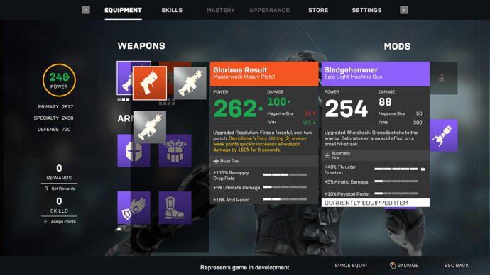 2. na hoffentlich schaut man sich nicht zuviel bei destiny ab. das balancing ist nämlich komplett für die tonne und die waffen lassen sich klassenübergreifend auch nicht vergleichen, weil es zwar überall leisten, aber keine konkreten zahlen gibt. das gleiche problem bei den mods. welche werte werden wie stark gesenkt oder erhöht und was stackt mit wem? geht den spieler scheinbar nichts an. zum glück hat anthem kein pvp. ansonsten war man ja schon auf dem richtigen weg. einen gesamtscore wie beim lichtlevel gab es ja schon. die waffen und skills und anzüge waren interessant, weil sie sich wirklich unterschiedlich gespielt haben. das sollte man mit blick auf die breite palette von mass effect weiter ausbauen. des weiteren kann man durch neue meisterwerkseigenschaften immer frischen wind ins gameplay und layout bringen. die hauptprobleme waren halt eher das eintönige endgame, die schlechten dropraten (und als sie durch einen fehler gut und alle glücklich waren hat man sie generft) und die limitierte vertikale progression. nächster schwierigkeitsgrade, besserer loot und ab dafür und BITTE KEINE täglichen/wöchentlichen limitierungen des besten loots aus stark eingeschränkten quellen ohne automatisches matchmaking, obwohl es meist auch mit ginge. der screenshot sieht links mit primary, specialty und defense übrigens auch ein bisschen nach the division aus.