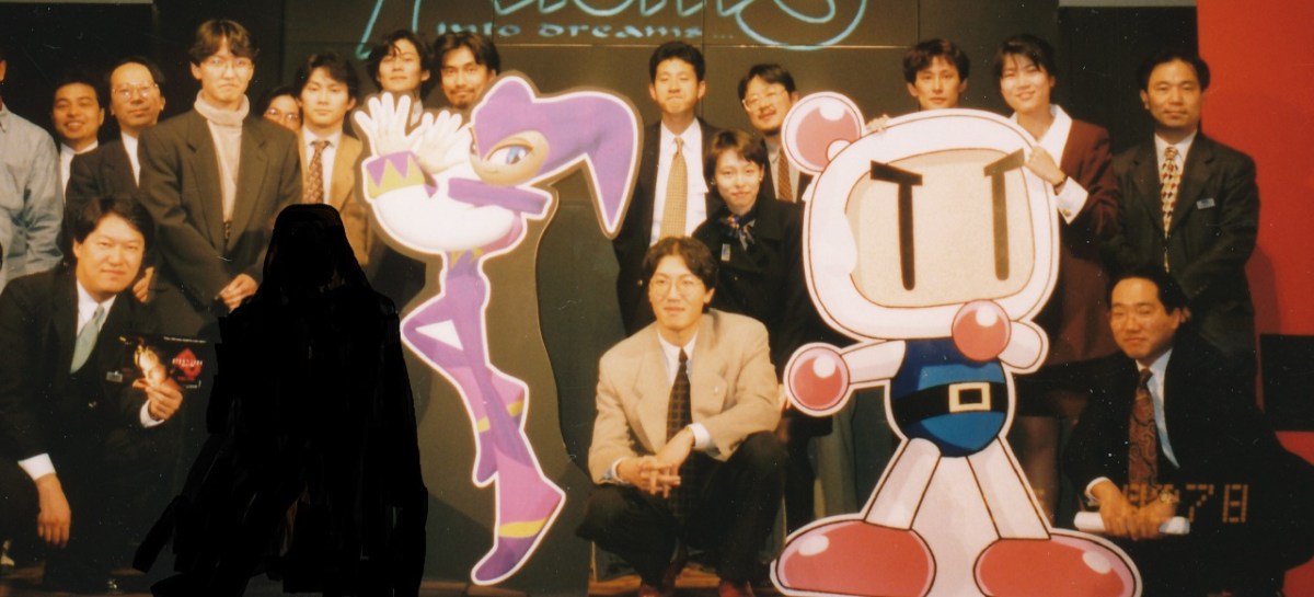 Zum 26. Jubiläum der Ankündigung des Saturn-Klassiker Nights into Dreams teilte Naka dieses Foto von der Spiel-Enthüllung anno 1996. Damals war er für das Spielkonzept und Oshima für das Design des fliegenden Harlekins verantwortlich. Wer sich wundert, warum Bomberman im Bild ist – der Saturn-Teil wurde damals auf derselben Veranstaltung vorgestellt. Viel spannender ist jedoch, was oder vielmehr wer nicht auf dem Bild ist: Naoto Oshima. Team-Chef Naka ist unten in der Bildmitte zu sehen, der knieende Herr im hellen Sakko. Links von ihm ist der Nights-Aufsteller, und wiederum links davon ein schwarzer Fleck. Dort befand sich offensichtlich Charakter-Designer Oshima.