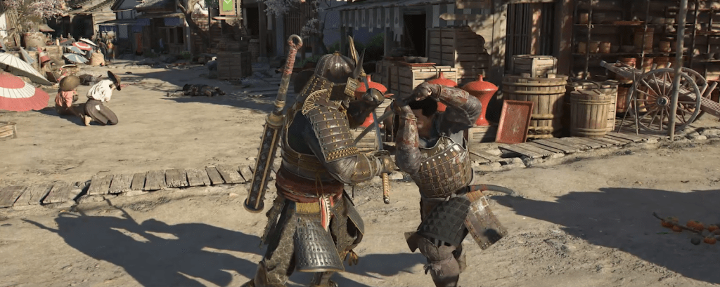 Yasuke reist durch die Stadt Fukuchiyama und wir bekommen zunächst all das zu sehen, was wir von einem Open World-Spiel in Japan erwarten, blühende Kirschbäume, weite Reisfelder, majestätische Tempel. Der Samurai trifft in den Straßen sogar auf einen süßen Akita Inu – und ja, natürlich könnt ihr ihn streicheln! Die Menschen begegnen dem fremdartig anmutenden Mann meist abweisend oder missbilligend – ein Samurai verheißt selten etwas Gutes. Zudem haben die Leute noch nie einen Menschen wie Yasuke, der einst als afrikanischer Diener nach Japan kam, gesehen. Mit seiner kräftigen Statur und der in Asien untypischen Körpergröße überragt er die meisten Einwohner um mindestens einen Kopf.