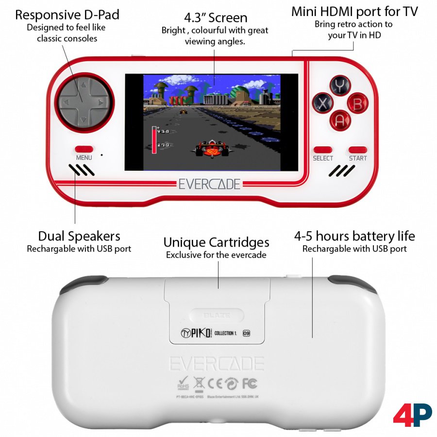 Der Evercade-Handheld-Bildschirm hat eine Diagonale von 4,3 Zoll (ca. 11 cm). Die Displaygröße soll in etwa mit der PSP vergleichbar sein. Die Spiele soll man im 4:3- oder 16:9 Seitenverhältnis spielen können. Die Batterie soll vier bis fünf Stunden durchhalten. Stereo-Lautsprecher sind verbaut. Ein 3,5mm-Klinkenstecker ist vorgesehen. Es wird außerdem möglich sein, die Handheld-Konsole via Mini-HDMI an einen Fernseher anzuschließen (Hochskalierung auf HD). Über die Spiele-Emulation schreiben die Entwickler wenig genau: „Wenn möglich, arbeiten wir direkt mit den ursprünglichen Software-/Emulator-Entwicklern zusammen, um sie bei ihrer harten Arbeit zu unterstützen und auch um sicherzustellen, dass ihre Emulation auf unserer Hardware genau umgesetzt wird.“