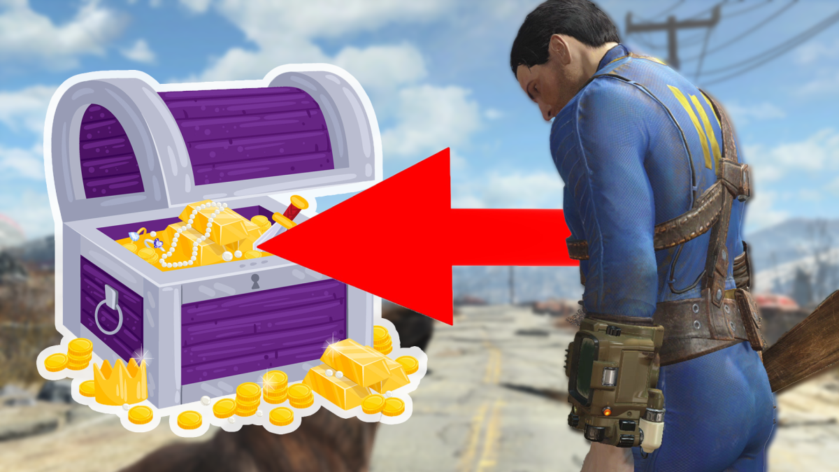 Ein Vault-Bewohner aus dem Computerspiel Fallout. Von der Person ausgehend: ein dicker, fetter, roter Pfeil. Jener Pfeil deutet auf eine geöffnete Schatztruhe, aus der Goldmünzen purzeln.