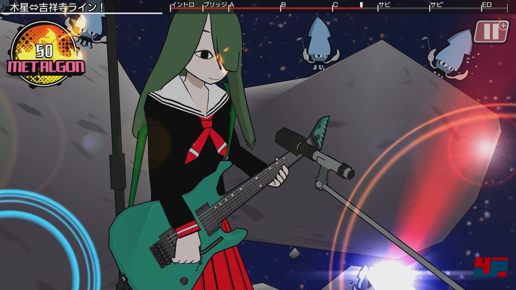 Was tun, wenn die Aliens angreifen? Ähnlich wie seinerzeit Ulala aus Space Channel 5 wissen auch die weiblichen Bandmitglieder aus Gal Metal, was zu tun ist. Die Agressoren werden einfach mit der Macht der Musik in andere Dimensionen versetzt. Um das für den Spieler möglichst realgetreu zu inszenieren, trommelt man offenbar persönlich mit den Joycons der Switch in der Luft herum.