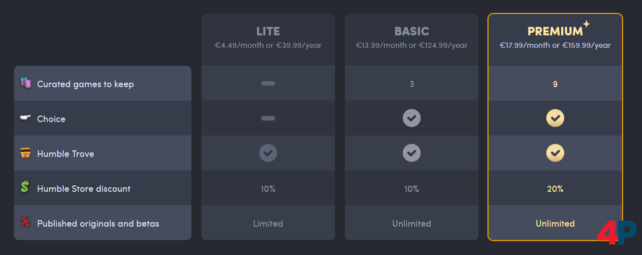 Diejenigen, die sich für das „Premium Abonnement“ (17,99 Euro pro Monat) entschieden haben, dürfen neun Spiele aus dem jeweiligen „Humble-Choice-Paket“ auswählen und diese dauerhaft behalten. Nutzer der „Basis-Version“ (13,99 Euro pro Monat) dürfen drei Titel wählen. Lite-Abonnenten (4,49 Euro pro Monat) haben keinen Zugriff auf Humble Choice, aber auf die Spiele-Bibliothek Humble Trove. Premium- und Basis-Abonnenten bekommen noch Zugriff auf Spiele, die von Humble als Publisher veröffentlicht werden. Im Vergleich zur alten Mitgliedschaft (Humble Monthly) bekommt man also Zugriff auf weniger Spiele und muss zugleich einen höheren Abo-Preis zahlen.