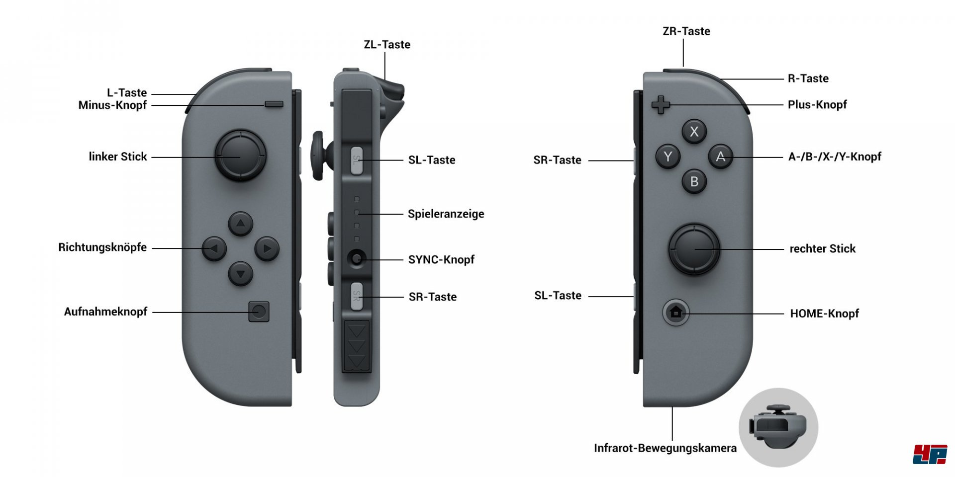 Nintendo beschreibt die Joy-Con-Controller folgendermaßen: „Man kann die Joy-Con sowohl unabhängig voneinander verwenden – mit einem in jeder Hand – oder gemeinsam als einen einzigen Controller, wenn sie an der Joy-Con-Halterung befestigt sind. Sie lassen sich aber auch direkt mit der Konsole verbinden, wenn man diese im Handheld-Modus nutzen möchte. (…) Jeder Joy-Con verfügt über einen kompletten Tastensatz und kann daher als separater Controller dienen. Darüber hinaus sind beide mit einem Gyrosensor und einem Beschleunigungssensor ausgestattet. Damit ermöglichen sie jeweils rechts und links eine unabhängige Bewegungssteuerung. (…) Am linken Joy-Con etwa befindet sich ein Aufnahmeknopf, der es den Spielern ganz einfach ermöglicht, Screenshots beim Spielen zu machen, die sie dann über die sozialen Netzwerke mit ihren Freunden teilen können. Der rechte Joy-Con verfügt über eine NFC-Schnittstelle für den Datenaustausch mit amiibo-Figuren sowie über eine Infrarot-Bewegungskamera. In dafür entwickelten Spielen registriert diese Kamera die Entfernung, die Umrisse und die Bewegungen naher Objekte. Sie kann u.a. feststellen, wie weit die Hand des Spielers vom Controller entfernt ist, und ob sie z.B. den Umriss von Stein, Schere oder Papier formt. In beide Joy-Con ist zudem eine fortgeschrittene HD-Vibration integriert. Sie macht sich in dafür vorgesehenen Spielen durch sanfte Schwingungen bemerkbar, die realistischer sind als je zuvor. Der Effekt ist so präzise, dass Nintendo Switch-Fans den Joy-Con z. B. wie ein Glas schwenken und dabei die Vibrationen einzelner, virtueller Eiswürfel spüren könnten, die darin zusammenstoßen.“
