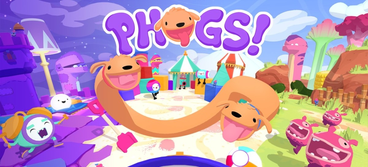 In der Spielbeschreibung heißt es: „In PHOGS! spielst du ein Hundeduo auf einem spannenden, rätselhaften Abenteuer. Sie sind durch einen dehnbaren Bauch miteinander verbunden und du musst dir deinen Weg durch Hindernisse freibellen, beißen oder springen. Im Coop oder Einzelspielermodus warten Welten zu den Themen ‚Essen‘, ‚Schlafen‘ und ‚Spielen‘ auf dich.