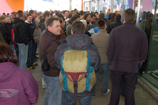 Immerhin ein klein wenig euphorischer wirkte die Stimmung beim Saturn in der Hamburger Innenstadt, als Jan mit seiner Kamera im Gepäck vorbei schaute: Ein Grüppchen von rund 120 Menschen wartete um 9.30 Uhr vor den Türen des Elektronikmarktes auf deren Öffnung. Das ist zwar nicht zu vergleichen mit dem Riesenansturm zum Wii-Start, jedoch nahm der Markt – anders als beim Start der Nintendo-Konsole – diesmal Vorbestellungen an.