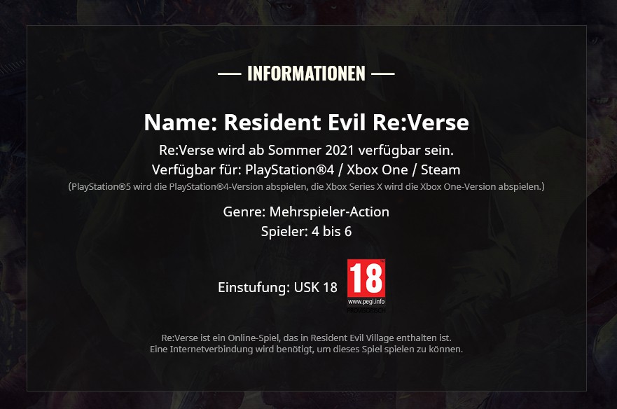 Capcom: „Zur Feier des 25-jährigen Jubiläums der Serie werden beliebte Resident Evil Charaktere und Biowaffen im Mehrspieler-Erlebnis Resident Evil Re:Verse zusammenkommen. Spieler*innen starten als menschlicher Charakter in 4- bis 6-Spieler-Deathmatches gegeneinander. Einmal tödlich getroffen, wird der Charakter als Biowaffe ins Spiel zurückkehren und Spieler*innen können Rache üben. Während der Runden können Virusfläschchen gesammelt werden. Je mehr Fläschchen als menschlicher Charakter gesammelt werden, desto stärker wird die Biowaffe sein, als die Spieler*innen zurückkehren. Das Mehrspieler-Erlebnis Resident Evil Re:Verse ist kostenlos für Besitzer von Resident Evil Village und erscheint für PlayStation 4, Xbox One und den PC. Besitzer einer Version von Resident Evil Village für PlayStation 5 oder Xbox Series X|S können über die Abwärtskompatibilität auf das Spiel zugreifen.“