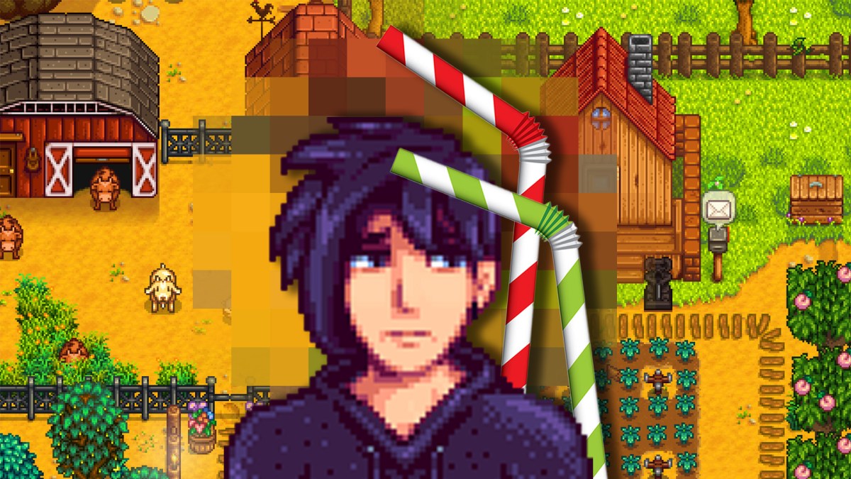 Sebastian aus Stardew Valley wird von zwei Strohhalmen bedrängt