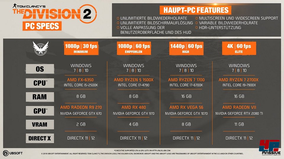 Ubisoft hat Details zu den Features der PC-Version und die Systemvoraussetzungen von The Division 2 veröffentlicht. Das Spiel wird am 15. März 2019 zeitgleich mit den Konsolenversionen erscheinen. Im Gegensatz zum Vorgänger wird die PC-Fassung nicht auf Steam vertrieben. Es wird ausschließlich via Uplay bzw. Ubisoft Store und im Epic Games Store erhältlich sein (wir berichteten).