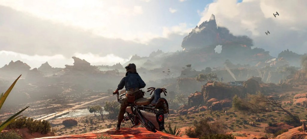 Kay Vess und Nix überblicken die Weite des Mondes Toshara. So viel Bewegungsfreiheit gab es in einem Star Wars-Spiel noch nicht. Credit: Massive Entertainment / Ubisoft