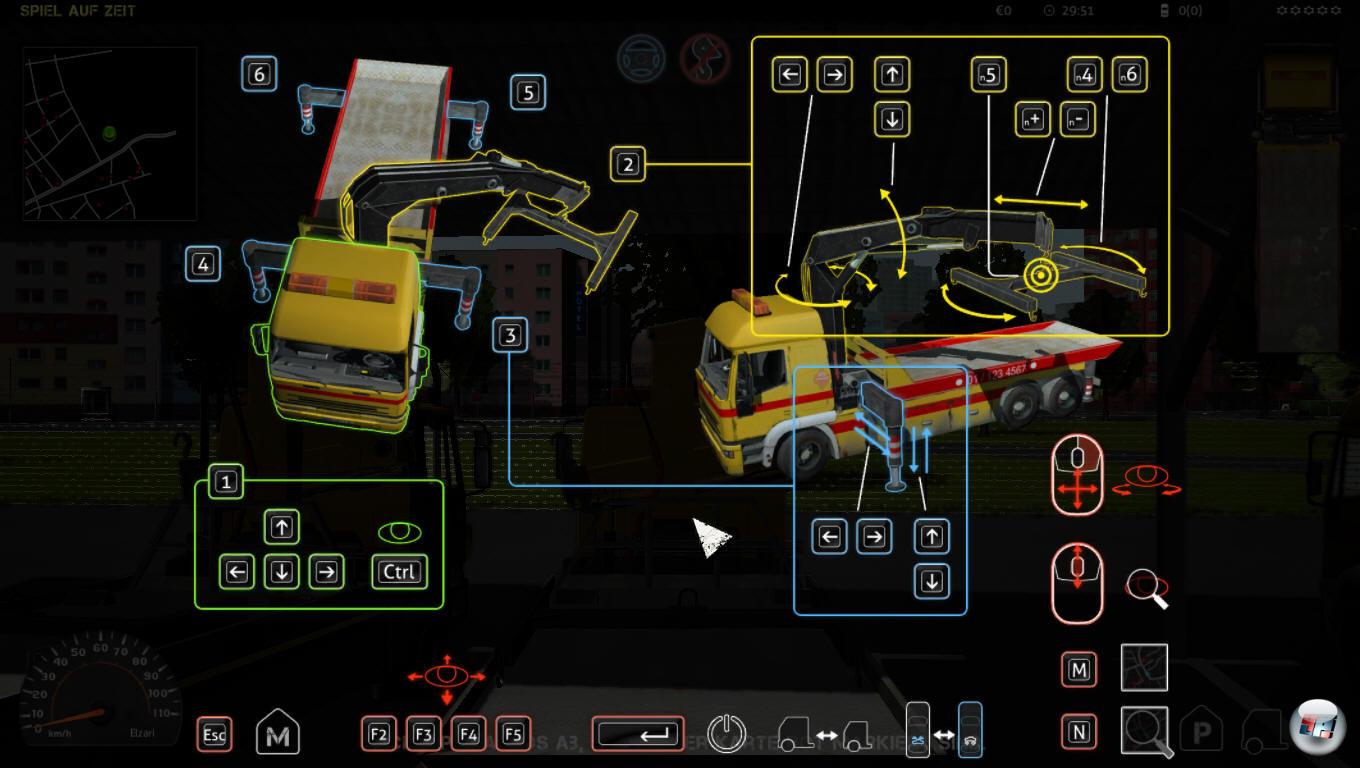 Casual oder Alltagssimulationsspieler müssen schon harte Hunde sein, zumindest in den Augen der Entwickler. Auch bei dieser Abschlepp-Sim glänzt das Tutorial nämlich durch Abwesenheit. Begrüßt werde ich auf dem Parkplatz des Fuhrparks lediglich mit dem Hinweis „F1 für Hilfe“ drücken zu können. Gesagt getan und da ist sie: Die vielleicht kürzeste Spielanleitung der neueren Videospielgeschichte – ein Screenshot mit den verfügbaren Tastaturbefehlen! An so etwas kann ich mich, wenn überhaupt, dann nur aus seligen C-64 Zeiten erinnern. Nun gut, zunächst entnehme ich der „Anleitung“ wie ich in die Cockpitsicht wechseln kann, denn damit steuert es sich im Allgemeinen realistischer- und darum geht es ja schließlich in einer Simulation. Nachdem mir in Ermangelung einer Sprachausgabe erneut per Texteinblendung mitgeteilt wurde, dass es sich bei den roten Punkten um Falschparker handelt, die es abzuschleppen gilt, fahre ich den ersten „Tatort“ an. Auf dem Weg dorthin touchiere ich ein Stopp-Schild, was mit einem Geräusch und einem Geldabzug von 35 Euro geahndet wird. Endlich mal Sanktionen, das ist doch mal was! Bei meinem ersten „Kunden“ angekommen, möchte ich mich an die Arbeit machen, doch mir wird kurzerhand mitgeteilt, das Auto sei zu schwer für mein Fahrzeug…aha?! Ergo: Es muss wohl auch die Möglichkeit geben, schwere LKW zu steuern? Abwarten. Zunächst gilt es ein geeignetes Opfer zu finden und dank der Tatsache, dass in der fiktiven Stadt offensichtlich mehr Autos falsch als korrekt parken, gelingt mir das recht schnell. Endlich darf ich mich ans Abschleppen wagen. __NEWCOL__