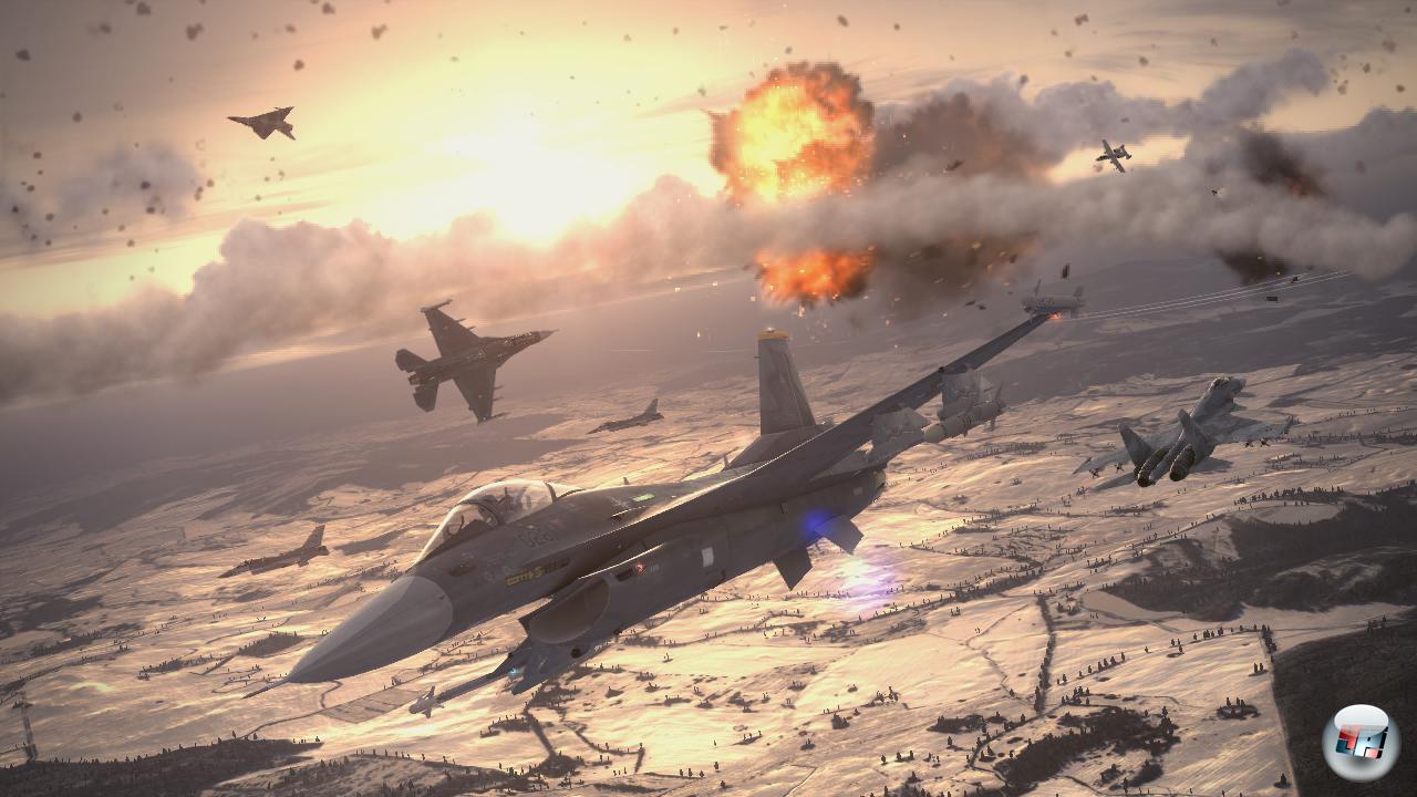 Serienüblich spielt Ace Combat in einem fiktiven Szenario: Emmeria gegen Estevokia, huch wie originell – es braucht nicht viel Phantasie, vor allem nicht angesichts der im Spiel verwendeten Akzente, um Parallelen zur Echtwelt herzustellen. Verwunderlich vor allem die Entscheidung, weil ebenfalls serientypisch die meisten Flugzeuge offiziell lizenziert sind: Von der F-16 über den Tornado, die F/A-18 und A-10 bis hin zur F-22 warten einige Maschinen auf euch, die auch über unseren Köpfen gelegentlich ihre Runden drehen. Aber Ace Combat wäre nicht Ace Combat, wenn die Designer sich nicht auch austoben dürften – und so bekommt ihr es über kurz oder lang nicht nur mit dem gemeingefährlichen Jäger CFA-44 Nosferatu, sondern auch mit gigantischen fliegenden Festungen zu tun, die, wie es Festungen nun mal so an sich haben, haarsträubend bewaffnet sind! Anfang steht eine einsame F-16C in eurem Hangar, der sich erst nach und nach füllt – mit dem Geld, das ihr für gemeisterte Missionen bekommt, könnt ihr euch neue Flieger und Waffen kaufen. Alle Maschinen unterscheiden sich hinsichtlich Angriffs-Schwerpunkt (Luft-Luft oder Luft-Boden), Geschwindigkeit oder Manövrierfähigkeit, so dass es nicht schaden kann, eine Mission mal mit einem anderen Flugzeug zu versuchen, falls man mal mit einem gar kein Land sieht. Das dürfte auf dem niedrigsten der drei Schwierigkeitsgrade kaum passieren, in dem selbst ein Bodencrash kaum Schaden anrichtet – man muss sich schon anstrengen, um abgeschossen zu werden. Die zweite Stufe ist genau richtig, hier beginnt ihr mit einigen gemütlichen Einstiegsmissionen, ab dem zweiten Drittel klettert der Anspruch der Missionen von Level zu Level angenehm an.