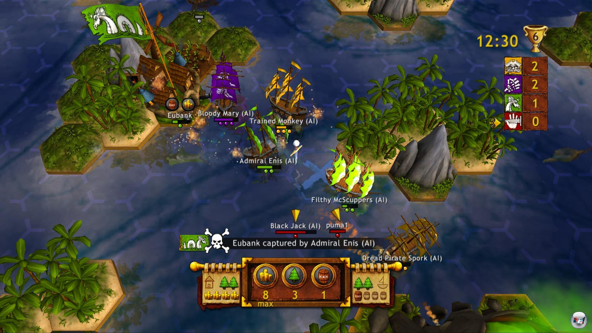 Dank eines komfortablen Editors könnt ihr sogar eigene Archipele entwerfen und euch auf diesen mit anderen Spielern messen. Auch KI-Piraten lassen sich anheuern, um selbst im kleinen Kreis große Schlachten zu bestreiten. Allerdings gibt es keine Möglichkeit, KI-Partner zu beeinflussen, da sie komplett eigenständig und mitunter dämlich agieren, was vor allem in der Einzelspieler-Kampagne ziemlich nervig sein kann. Wer allein in See sticht, bekommt zwar 21 durchaus fordernde Story-Missionen serviert, ist aber auch auf Gedeih und Verderb den Launen seiner KI-Mitsegler unterworfen. Doch tröstet euch, die Computergegner sind ebenfalls nicht die hellsten und bleiben schon mal an einer Meerenge vor beiden Seiten minutenlang regungslos stehen, weil sie sich nicht entscheiden können, wer Vorfahrt hat. Reines Kanonenfutter sind sie allerdings auch wieder nicht – allein schon weil sie zahlenmäßig fast immer in der Überzahl sind und gerne rudelweise zuschlagen.