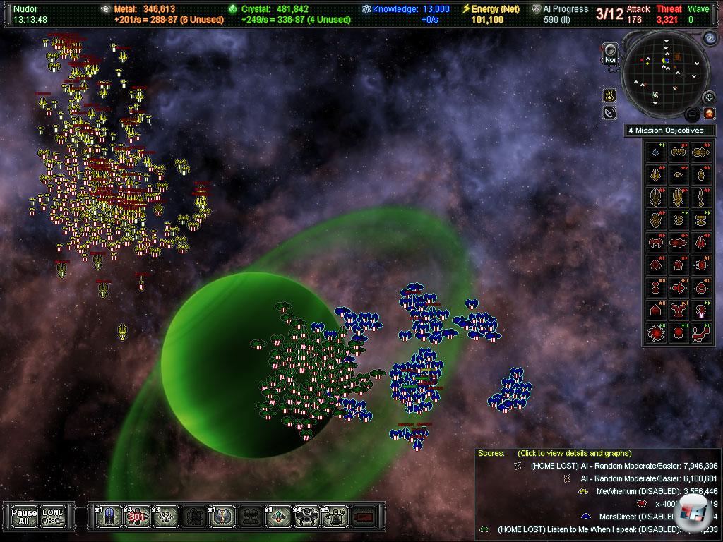 Ihr solltet also nicht einfach versuchen, jeden Planeten einzunehmen. Dadurch würde der KI-Fortschritt zu schnell steigen und die Reaktion wäre eine gewaltige feindliche Flotte, die zum Angriff ausholt. Die Computerintelligenz soll hier keinen menschlichen Gegenspieler imitieren, sondern eine „KI“ und diese reagiert ausschließlich auf eure Aktionen mit einem großen Potenzial an möglichen Mehr-Fronten-Kriegen. Generell präsentiert sich der Computergegner als starker und fordernder Kontrahent, selbst auf den niedrigen Schwierigkeitsstufen. Mit zahlreichen Profilen und Optionen lassen sich die Gefechte, die je nach gewählten Größendimensionen locker mehrere Stunden oder Tage dauern können, weiter individualisieren, ganz zu Schweigen davon, dass die KI genau weiß, welche Einheiten sie benutzen muss, um eure Truppen auszukontern.