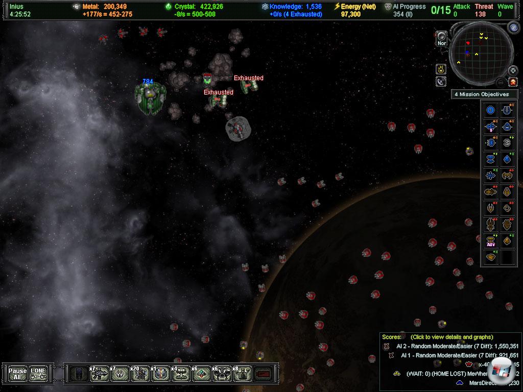 Zerstört ihr beispielsweise Kommandostationen und Sprungtore steigt der „KI-Fortschritt“, der praktischerweise neben den Ressourcen angezeigt wird und indirekt die Stufe angibt, wie sehr euch der Gegner als Bedrohung ansieht. Reizt ihr den Feind zu stark, wird dieser euch öfters und mit größeren Flotten angreifen. Haltet ihr eure Expansion in Grenzen, erobert nicht jeden Planeten, sondern Schlüsselsysteme und schaltet vorher Sensoren („die Augen des Gegners“) aus, wird die Reaktion nicht so wuchtig ausfallen. Die Gegenaktionen der KI könnt ihr keinesfalls verhindern, ihre Intensität aber durch strategisches Eroberungsmanagement modulieren. Wichtige Wurmlochknotenpunkte oder Sektoren mit Mark IV-Einheiten-Fabriken (der Spieler kann diese High-Tech-Fabriken nicht selbst errichten) solltet ihr fokussieren und vollends ausbeuten. Da eure Flotte nicht an jedem Krisenherd anwesend sein kann, lassen sich energiefressende Verteidigungsanlagen errichten und mit der Zeit tendiert der Planetenschutz in Richtung „Tower Defense“.