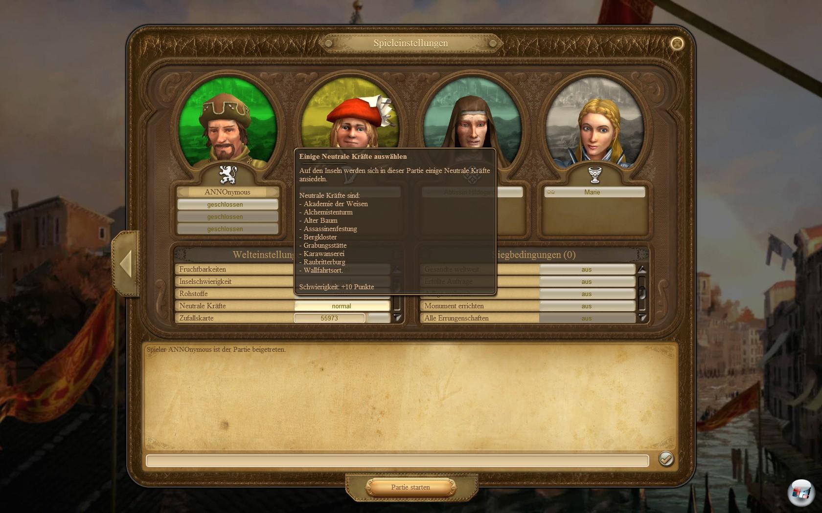 ebenfalls in den meist lang dauernden Partien (mehrere Stunden sind keine Seltenheit). Bei der Erstellung eines Matches stehen euch viele Optionen zur Verfügung. Neben wahnsinnig starken Korsaren und allerlei zuschaltbarer Katastrophen können Startruhm, Anfangsgold, Ressourcen-Verteilung sowie der Start mit einer kleinen Armada ausgewählt werden, damit die anfängliche Bauphase beschleunigt wird – eine gute Idee. Siegbedingungen dürfen ebenso reichhaltig festgelegt werden: Vermögen, Anzahl der Adeligen oder Gesandten, Schiffe versenken, letzter Überlebender, Bündnis mit allen, etc. Viel zu meckern gab es bei Performance und Stabilität des Mehrspieler-Modus während der Probepartien, bis auf wenige Lags, übrigens nicht.