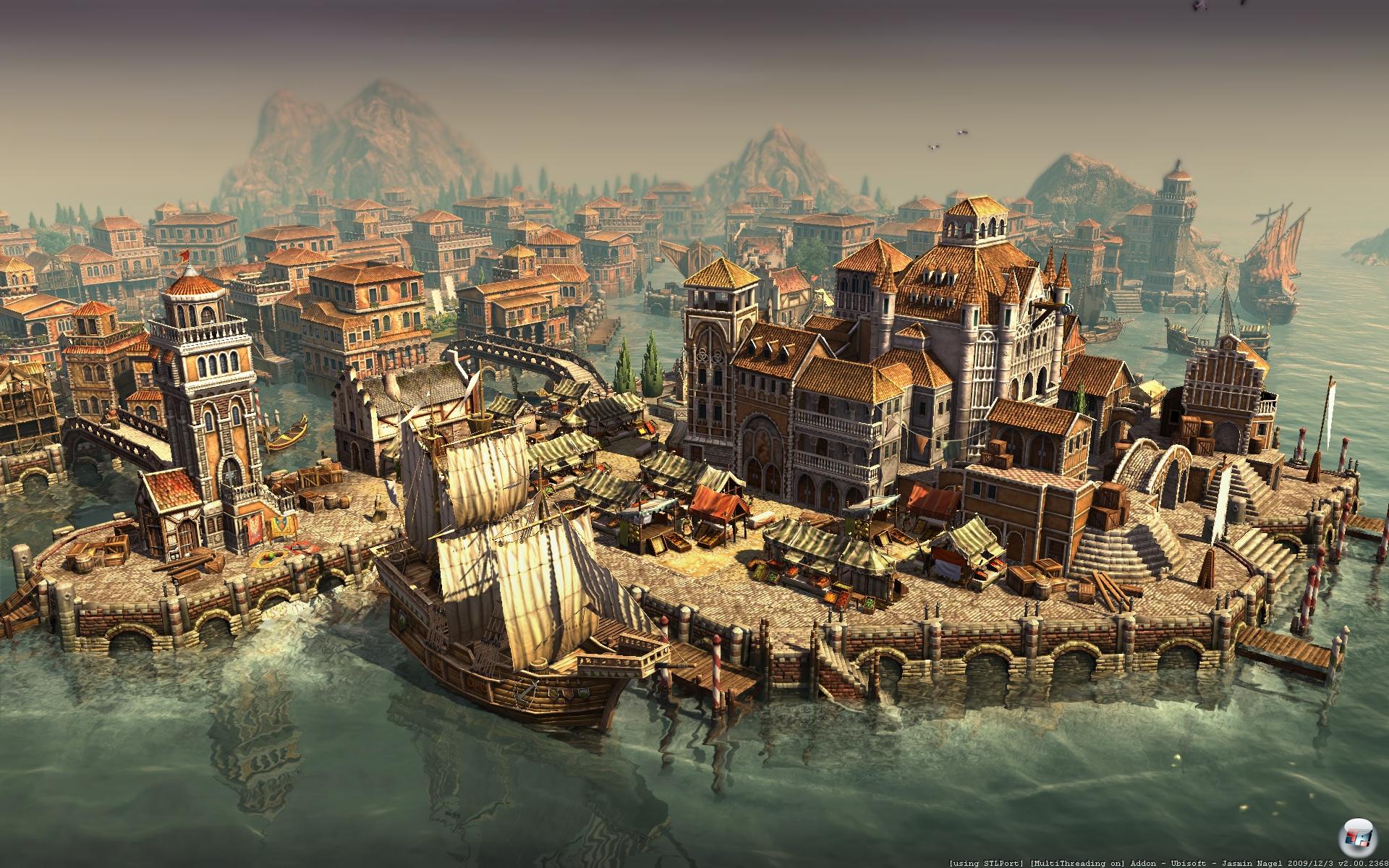 Obgleich „Venedig“ im Titel der Erweiterung steht, fällt der tatsächliche Effekt der liebevoll nachgebildeten Hafeninsel eher mau aus. Sie dient als übergeordnete (theoretische) Verbindung für Spionage sowie die Ratsversammlung und ist ansonsten nur ein neutraler Hafen, vergleichbar mit einem abgespeckten Orienthafen oder Lord Richard Northburgh. Ihr fahrt mir eurem Schiff dorthin, tretet mit ‚Giacomo Garibaldi‘ in Kontakt, könnt Waren sowie Items einkaufen, neue Errungenschaften erlangen und allerlei ruhmrelevante Aufträge für den Repräsentanten der Republik von Venedig erfüllen. Mehr als ein weiterer NPC-Anlaufhafen ist dies nicht und da ihr keine venezianischen Gebäude in eurer Siedlung errichten könnt, haben es die Entwickler verpasst, ein Äquivalent zum Orient aufzubauen. Selbst eine Erweiterung des eigentlichen Spielkerns, des Wirtschaftssystems, gibt es nicht: Weder neue Waren oder Produktionsketten sind vorhanden. Es hätte ja keine ultimative neue Kette rund um die Metropolenwaren geben müssen, aber vielleicht eine neue Ressource, die man über „Venedig“ kennen lernt, abbaut und weiterverarbeitet – um zum Beispiel Spionage durchführen oder den eigenen Palast aufbauen zu können. Richtig gelesen, der eigene Palast ist wieder enthalten und kann als Symbol der Macht aufwändig und mit reichlich Tamtam errichtet werden.
