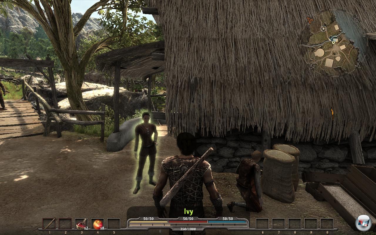 Was macht man, wenn man drei Prüfungen für eine Heirat bestehen soll, aber die versprochene Lady gar nicht kennt? Kauft man da nicht die Zicke im Sack? Dabei heißt sie Ivy, was durchaus die üppige Fantasie anregt, sie sieht bis auf ihre seltsame Haltung sowie die grenzdebile Gestik sogar ganz nett aus und fragt mich keck und direkt in den ersten Spielminuten: „Krieg ich einen Kuss?“. Es könnte schlimmere Aussichten geben, wenn man gerade aus einem Alptraum erwacht, der mich im Einstieg gegen Untote kämpfen lässt. Aber irgendwie braucht man etwas mehr emotionale Anbindung, um sich für den Schwiegervater wie ein kampfbereiter Hahn in drei erste Quests zu stürzen.