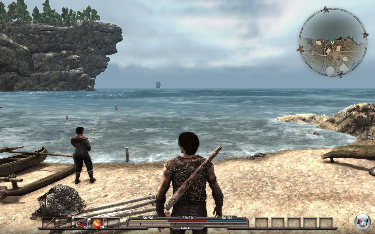 Obwohl die Entwickler von Spellbound mit einem „Creating Emotions“ als Motto werben, versagen sie bei der emotionalen Dramaturgie und vor allem der Gesprächskultur des Einstiegs so deutlich, dass man sich im Zeitalter von The Witcher <a class="DYNLINK" onmouseover="DynToolTipp_Show('Klicken für Gameinfos‚)“ onmouseout=“DynToolTipp_Hide(); “ href=“javascript:DynCont_Display(‚Gamefinder‘,’runmod.php?sid=%7BSID%7D&LAYOUT=dyncont_gf&spielid=5553′)“>, Dragon Age <a class="DYNLINK" onmouseover="DynToolTipp_Show('Klicken für Gameinfos‚)“ onmouseout=“DynToolTipp_Hide(); “ href=“javascript:DynCont_Display(‚Gamefinder‘,’runmod.php?sid=%7BSID%7D&LAYOUT=dyncont_gf&spielid=5552′)“> & Co fast für das infantile Drehbuch um einen charakterlosen Schönling fremdschämen muss – von den Sprung- und Laufanimationen aus der Sharewaretonne ganz zu schweigen. Aber wichtiger als steifes Gehüpfe ist in einem Rollenspiel die Kommunikation: Ich habe selten so gestelzte, so unnatürlich und steif wirkende Dialoge geführt, die mit all den schrecklichen Einzeilern kaum eine Auswahl an Antworten lassen. Ich konnte zu Beginn keinen Charakter erstellen, ich kann auch später nichts selbst entscheiden oder beeinflussen, ich muss einfach das machen, was man verlangt – gerettet wird dieser schreckliche Einstieg nur von der Landschaft und Diego, der als gut designter Charakter wenigstens etwas Flair und Reife verbreiten kann. Er macht regelrecht Hoffnung auf eine qualitative Entwicklung.
