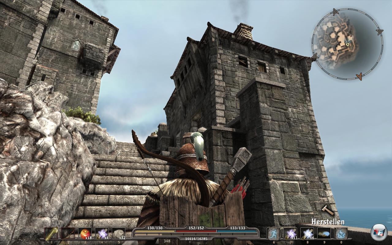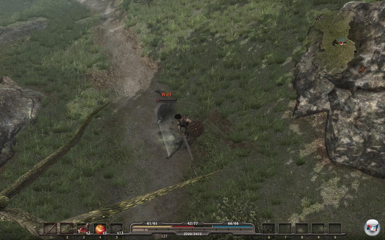 Nur ganz selten muss man blocken oder ausweichen, wenn sich die Feinde mal clever unterstützen und ihre Magie oder Pfeile nicht in Felsen jagen – was leider viel zu oft vorkommt. Manchmal rennt man einfach hinter einen Schutthaufen und hört den Schamanen eifrig Blitze in ihn schleudern – einen, zwei, drei, vier oder fünf. Dann rennt man herum und muss das armselige Schauspiel unterbrechen. Aber selbst wenn man sich offen stellt und selbst bei angedeuteten „Bossen“ ist das Kampfsystem im Zeitalter von Fable II<a class="DYNLINK" onmouseover="DynToolTipp_Show('Klicken für Gameinfos‚)“ onmouseout=“DynToolTipp_Hide(); “ href=“javascript:DynCont_Display(‚Gamefinder‘,’runmod.php?sid=%7BSID%7D&LAYOUT=dyncont_gf&spielid=9783′)“>