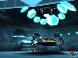 Apropos: Die Hauptfigur wird in der Originalfassung übrigens von David Duchovny, besser bekannt als Serien-Agent Fox Mulder, synchronisiert. Stellt ihr die PS2 auf Englisch um, könnt ihr auch mit der deutschen Version von Area 51 die Originalsprecher hören, zu denen auch der weniger bekannte Schauspieler Powers Boothe gehört. Allerdings sei gesagt, dass Duchovny mit seiner monotonen Gähn-Stimme erneut den Eindruck erweckt, kurz vorm Einschlafen zu sein. Überzeugender klingt da schon Schock-Rocker Marilyn Mansion, der im Spiel ein Alien verkörpert – wie passend. Doch die deutsche Synchronisation kann sich ebenfalls hören lassen, auch wenn Midway leider nicht den Original-Sprecher von Akte X gewinnen konnte. Dennoch wirken die professionellen Sprecher glaubhaft, ziehen euch ins Spielgeschehen hinein und übertreffen insgesamt sogar die prominente Originalbesetzung.
