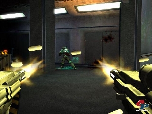 Vordergrund, doch die Entwickler schaffen es immer wieder, mit gezielten Schockeffekten für kurze Schreckmomente zu sorgen. Dazu trägt auch das Design der Kreaturen bei, die von keinem Geringeren stammen als Stan Winston, bekannt durch die Mitarbeit an Film-Monstern wie Alien oder Predator. Leider kommt die Gegner-KI im Vergleich zu euren Kameraden nicht über den Durchschnitt hinaus und präsentiert sich oft als reines Kanonenfutter. Problematisch wird es nur, wenn die Feinde in Scharen angreifen oder aus der Ferne attackieren – da ein Radar fehlt, ist es manchmal schwierig, die weiter entfernten Gegner zu orten. Genau wie in Doom 3 könnt ihr auch in Midways Shooter mit einer Taschenlampe etwas Licht ins Dunkel bringen. Da die Funzel direkt an den Waffen montiert ist, dürft ihr im Gegensatz zum Doom 3 gleichzeitig leuchten und schießen. Auch wenn die Grafik insgesamt gut und stimmig gelungen ist, kommt sie nicht ganz an das ID-Vorbild heran. Vor allem bei den Lichteffekten hätte etwas mehr drin sein können – immerhin lebt das Spiel von dem düsteren Setting. Dennoch kann sich die Präsentation auf beiden Konsolen sehen lassen und zieht den Spieler in ihren Bann. Im direkten Vergleich zwischen beiden Fassungen hat die Xbox-Version durch schärfere Texturen, mehr Details und bessere Effekte leicht die Nase vorn. Auf der PS2 geht die Engine in späteren Leveln dagegen auch schon mal in die Knie. Durch die höhere Auflösung übertrifft die PC-Fassung sogar noch die Konsolenvorbilder, doch kamen unsere Testrechner (Pentium IV, 3 GHz, 512MB RAM, Radeon 9800 XT) bei zu vielen Gegnern schon unter einer 1024er-Auflösung gehörig ins Schwitzen und trübten die Action durch z.T. heftige Ruckler.