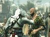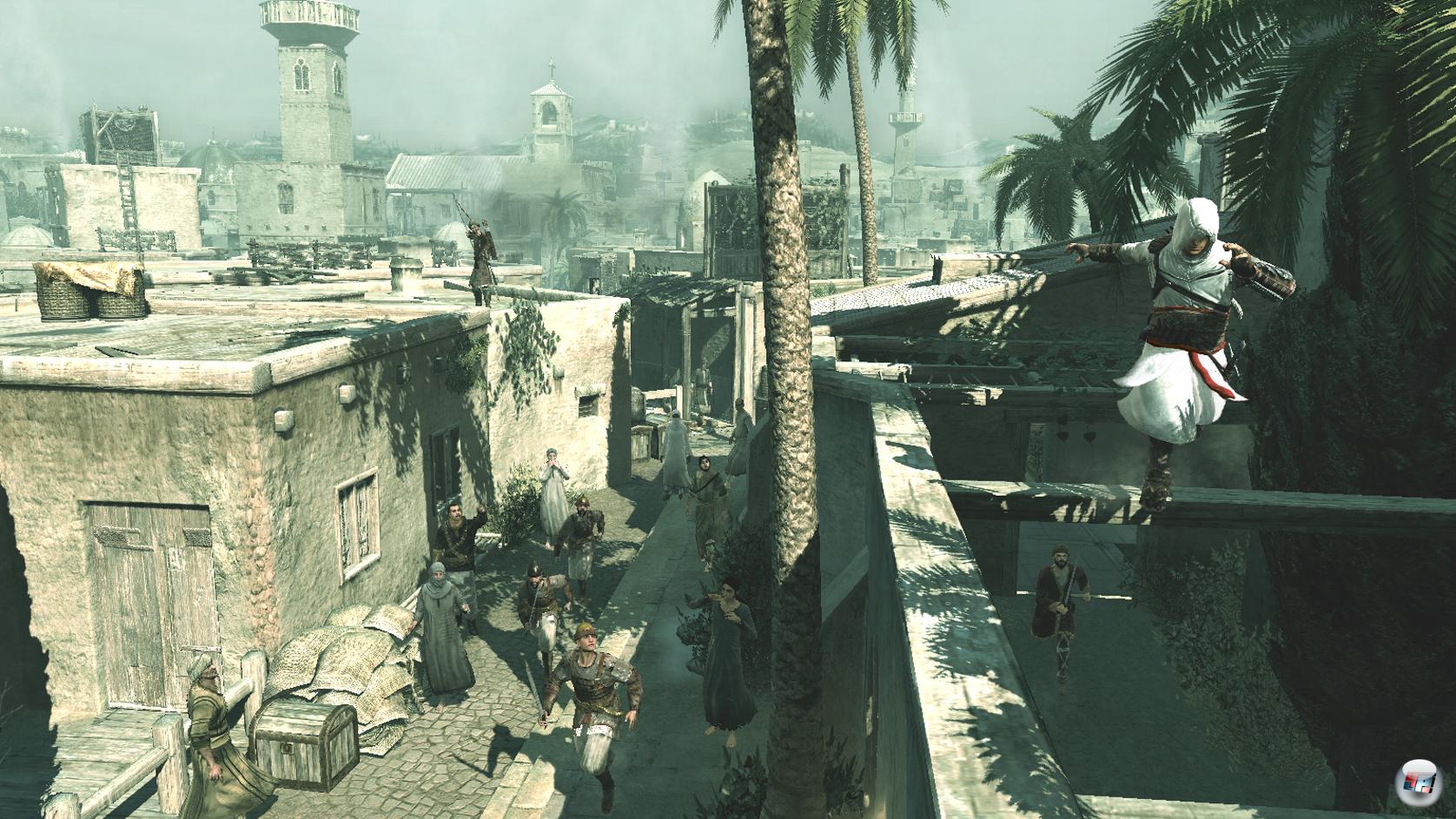 Großen Anteil daran hat der Mix aus Spielmechaniken und viel mehr noch die imposante Kulisse. Denn spätestens wenn ich nach einem Attentat auf der Flucht vor meinen Verfolgern über die Dächer von Akkon, Jerusalem oder Damaskus fliehe oder vergeblich versuche, in der Bevölkerung oder im Kampf mein Heil zu suchen, geht der Adrenalinspiegel steil nach oben. Und es ist mir absolut egal, ob ich irgendwo in meinem Hinterkopf weiß, dass ich eigentlich gar nicht in der Vergangenheit bin. Auch die durch moderne Technik unterstützte Zielerfassung, die mich bei einem Titel wie der Thief-Serie normalerweise in ein tiefes Atmosphäre-Tal stürzen würde, stört mich hier überhaupt nicht mehr. Die Illusion ist nahezu perfekt und die Ebenenverwirrung Realität/Alternative Realität/Vergangenheit/Erinnerte Vergangenheit unterstützt entgegen aller Erwartung die Atmosphäre.