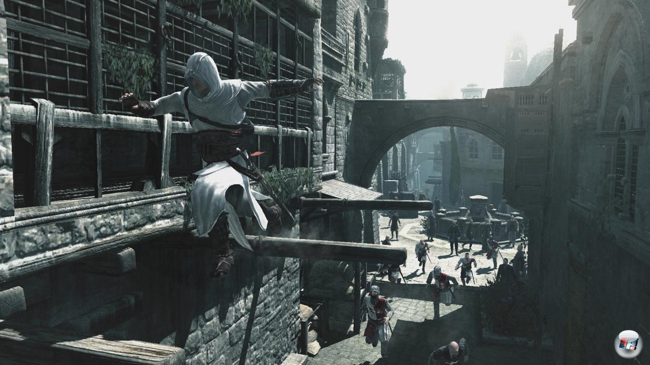 Da zudem wie bei Zelda ein automatisches Springen eingeführt wird, das nur dann gefährlich enden kann, wenn man sich in der Breite des zu überwindenden Abgrunds verschätzt, sehen sowohl Verfolgungsjagden als auch das Herumstöbern in der Stadt spektakulär aus, lassen sich aber sozusagen mit Links erledigen. Wenn nicht die Kamera in seltenen Momenten einen kleinen Strich durch die Rechnung macht und Altair statt der Leiter formschön direkt daneben versucht, die Mauer hochzurennen – natürlich vergeblich.