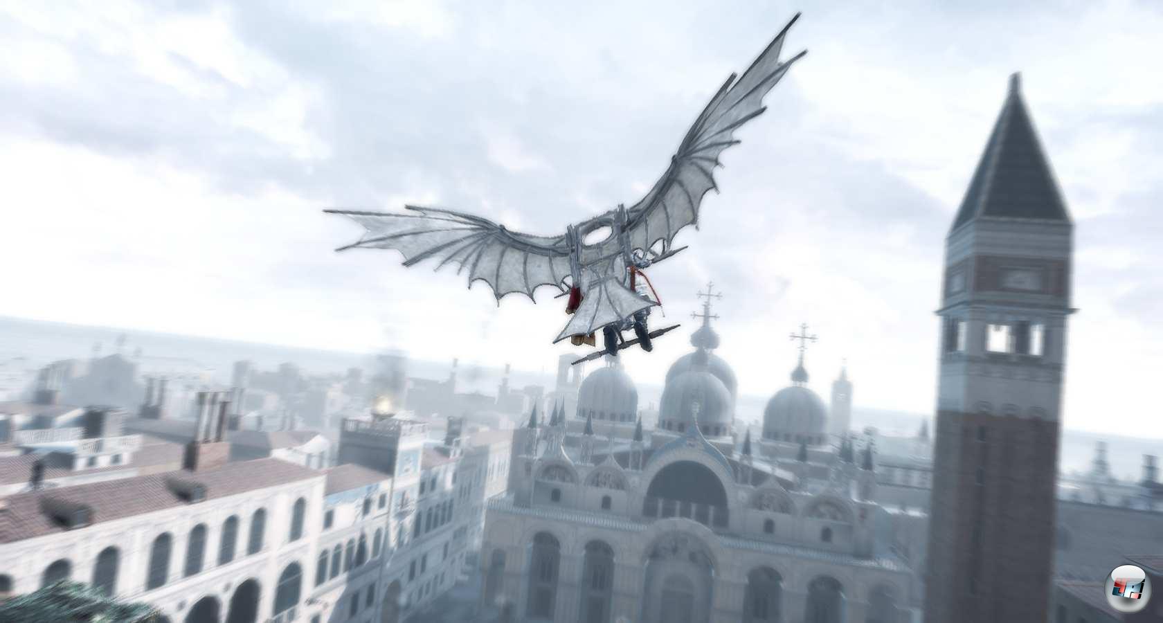 | Wenn man mit Leonardo da Vincis Fluggerät unterwegs ist, kann man die Sichtweite und Architektur aus einer neuen Perspektive genießen. |