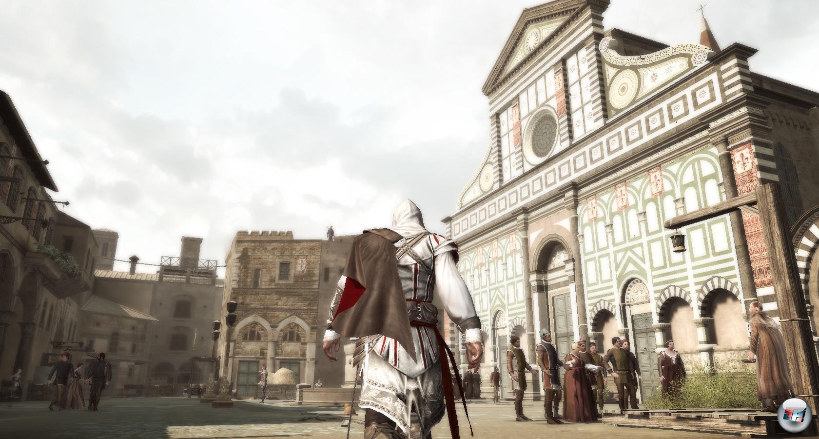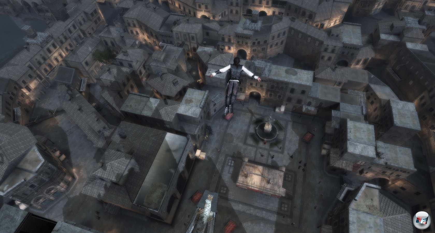 Die gibt es in AC2 – allerdings leider nicht so konsequent und weitreichend, wie ich es mir vorgestellt hatte. Denn im Wesentlichen klettert Ezio die italienische Architektur ebenso frisch, fromm, fröhlich und frei sowie mit minimalem Einsatz empor. Es wird zwar eine neue Mechanik eingeführt, die geringfügiges Timing erfordert, um höhere Sprünge von Stein zu Stein einzuleiten, die ab und an sogar eingesetzt werden muss, um weiterzukommen. Doch gibt es dadurch keine grundsätzliche Änderung des Spielgefühls.