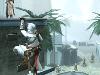 Nach dem Späh-Ritual auf dem alles überragenden Aussichtpunkt wird eine neue Markierung auf der Karte angezeigt. Also stürze ich mich mit einem beherzten Satz dutzende von Metern in die Tiefe und lande wohlbehalten in einer kleinen Schubkarre voller Heu. Diese Wägelchen stehen in vielen der Gassen herum und dienen mir in brenzligen Situationen als Versteck vor alarmierten Wachen. Kaum springe ich ins getrocknete Gras oder in einen der Pavillons auf den Dächern, interessieren sich die aufgescheuchten Verfolger nicht mehr für mich. Hier unten in den engen Gassen macht die Grafik sogar einen richtig hübschen Eindruck: Mein Assassine rauscht windschnittig in seiner stilvollen Kapuzenkutte durch die Häuser, von denen manche das Auge sogar mit brüchigen Oberflächen verwöhnen.