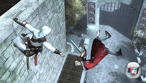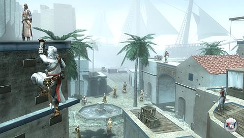 Der weiße Dunst ist beinahe so dicht wie bei einem Ausflug ins Weserbergland, wenn man einen diesigen Tag erwischt. Die Entwickler haben das trübe Wetter nicht ohne Grund aufziehen lassen: Während Altair auf einem hohen Turm hockt und sich einen Überblick über die Stadt verschafft, blinken ein paar Blöcke weiter ganze Häuserfronten ins Bild und werden genau so schnell wieder ausgeblendet. In der PSP tickt natürlich kein Next-Gen-Grafikchip – das ändert aber nichts daran, dass die gelegentlichen Pop-ups nicht gerade für die Illusion einer glaubwürdigen Stadt sorgen.