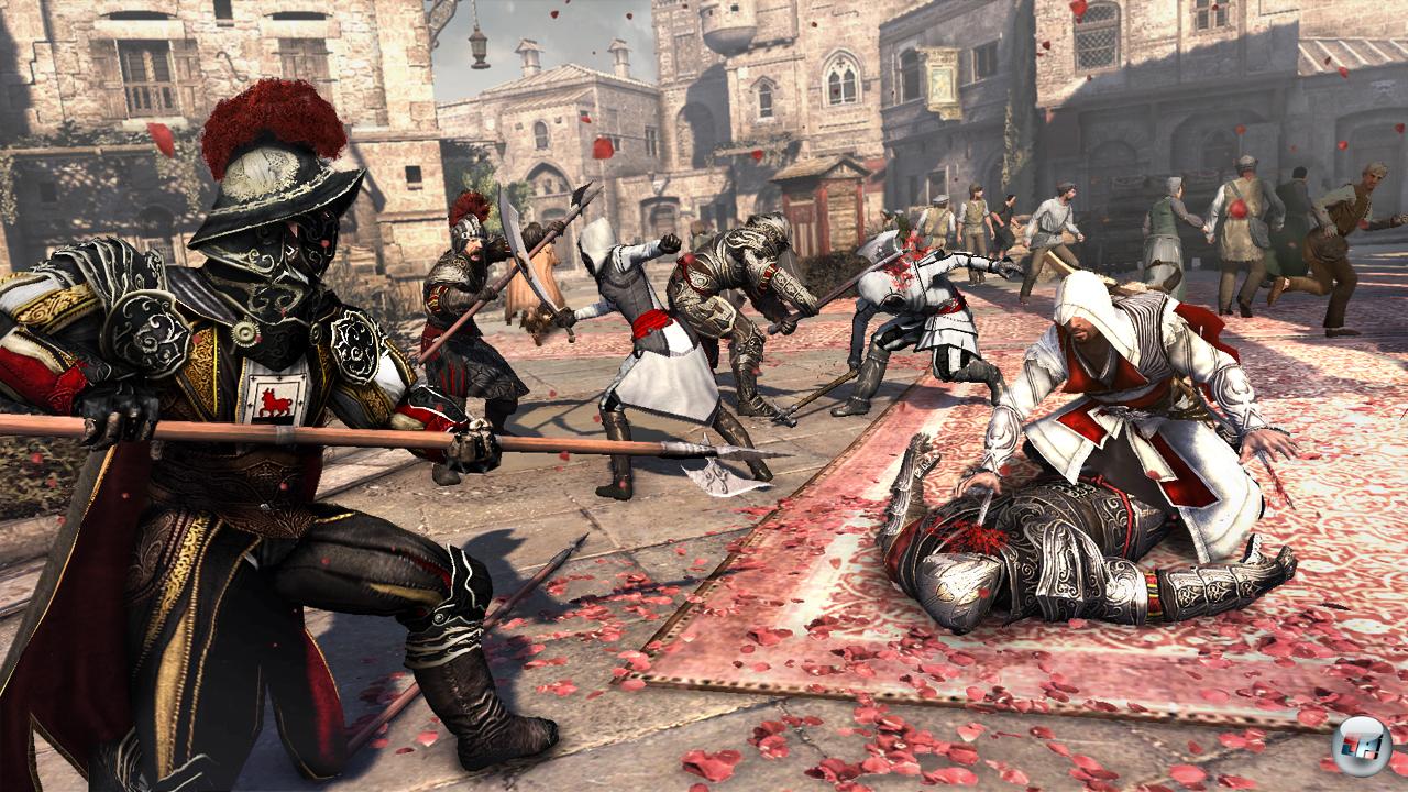 Angesichts der mitunter etwas ins Stocken geratenden Kämpfe, die Ezio bislang im Renaissance-Italien ausfechten musste, ist die Ergänzung um Kombo-Ketten eine sehr sinnvolle Aufwertung, die die ansehnlich choreografierten Gefechte noch dynamischer macht: Kontert man einen Gegner erfolgreich und tötet ihn mit dieser Aktion, kann man per Knopfdruck einen Angriff initiieren, der den anvisierten Gegner mit einem Streich niederstreckt, bis man entweder selbst wieder getroffen wird (was schnell passieren kann, da man seine Aufmerksamkeit auf den Kombo-Erhalt richtet) oder aber die Gegner besiegt wurden.