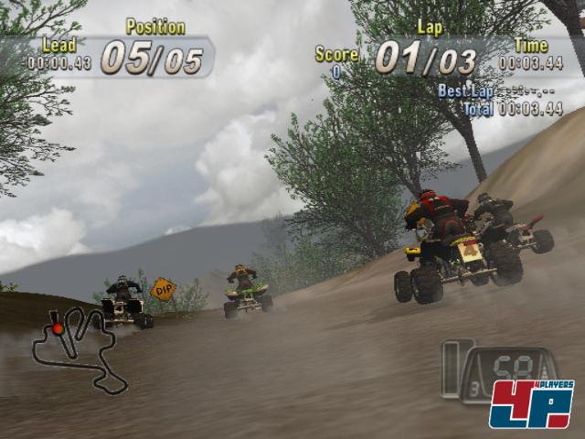 Ich frage mich, was an Motocross-Titeln mit ihren überschaubaren Strecken sowie der relativ geringen Anzahl an Vehikeln so lange Ladezeiten rechtfertigt: Genau wie MX Vs ATV Unleashed ist auch bei Offroad Fury 3 der Ladebildschirm verdammt oft und lange auf der Mattscheibe zu sehen. Okay, ganz so krass wie im THQ-Titel ist es nicht, doch bleibt es mir nach wie vor ein Rätsel, was da so lange in den Speicher geschaufelt wird… Sind es die matschigen Texturen, die vor allem in Kurven trotz löblichem 60Hz-Modus an mir vorbei ruckeln? Oder machen vielleicht die wenig detaillierten Vehikel mit den nur durchschnittlich animierten Fahrern der PS2 das Leben so schwer? Die Antworten kennen wohl nur die Entwickler von Climax, die sich mit diesem Titel nicht gerade mit Ruhm bekleckern: Zu altbacken und flimmeranfällig wirken die Matschpisten, zu störend die immer wieder auftauchenden Slowdowns, so dass auch hier die ATVs den Spielspaßhügel nicht erklimmen können. Die gegnerischen Fahrer tragen ebenfalls ihren Teil dazu bei: Zwar ist das Gummiband dieser KI nicht so straff gespannt wie bei der Konkurrenz, dafür scheint es jedoch vermehrt nur in eine Richtung zu arbeiten, nämlich in die der KI. Liegt ihr vorne, könnt ihr euch niemals wirklich absetzen und die Verfolger kleben an eurem Heck. Liegt ihr dagegen zurück, fällt es oft sehr schwer, wieder den Anschluss zu finden, zumal wir oft beobachten konnten, dass sich ein bis zwei Fahrer an der Spitze deutlich von den anderen absetzen. Von daher können die Rennen gerade für Anfänger schnell frustrierend werden. Ebenfalls etwas seltsam erscheint die Punktevergabe für Stunts: Wenn die Konkurrenten eine Highscore nach der anderen einfahren, ich aber fast nie Tricks bei deren Sprüngen zu Gesicht bekomme, frage ich mich, wie eine solche Punktzahl zustande kommen kann. Musikalisch werden die Ausflüge von rockigen