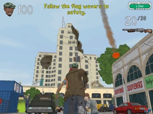 Die Existenz der Zombies wird gleich im Vorspann erklärt, wo ein mit Giftfässern beladenes Flugzeug auf den Highway knallt und die Bevölkerung von den ausströmenden Gasen in Untote verwandelt wird. Euch ist das aber egal, solange ihr nicht das Ziel erhaltet, eine bestimmte Anzahl Zombies zu töten oder sie mit einer Ladung Feuerlöschschaum wieder zu Menschen zu machen. Manchmal müsst ihr auch die aus dem Nichts aufgetauchten Terroristen beseitigen. Der „Witz“ dabei: Nur nach dem Erledigen der geforderten Quote kommt ihr weiter, andere Auswirkungen hat es nicht. Ganz abgesehen davon, dass nach jedem erledigtem Bösewicht irgendwo ein neuer platziert wird. Müsst ihr gerade weder Terroristen noch Monster aus der Welt schaffen, lauft ihr zum Zielpunkt, wo der nächste Auftrag wartet.