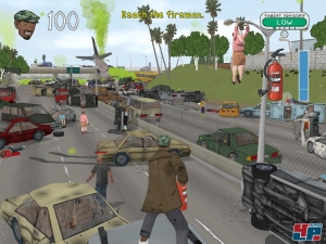Terroristen schießen auf euch, Zombies kotzen Gift, Statisten fangen Feuer – und euch ist stinklangweilig. Denn so abgedreht die Ideen auch sind, spielerisch sind sie nutzlos. Ihr könnt zwar ins Geschehen eingreifen und eure Beliebtheit bei der Masse erhöhen, indem ihr Brände löscht oder Passanten heilt, doch das bleibt ohne Konsequenzen. Nur wenn ihr ein halbes Dutzend Bürger über den Haufen knallt, wird die Meute sauer und schmeißt mit Burgern oder Blumentöpfen nach euch. Holt dann einfach den Feuerlöscher raus und verwandelt ein paar Zombies wieder in Menschen. Problem erledigt, nutzlos Zeit verschwendet, mal im Klartext: Was nützt ein mit kreischenden Figuren vollgestopftes Spiel, in dem ich nichts anderes zu tun habe, als stupide Gegner in einer nervenden Kulisse abzuknallen?