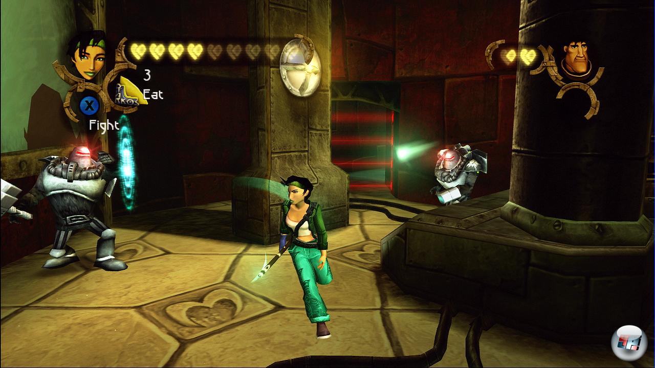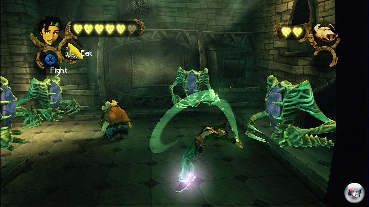 Oder ihr investiert lieber in einen Detektor, um alle Perlen auf der Karte zu sehen. Oder in einen Sensor für versteckte Tiere? Oder einen Verstärker für Angriffe? Selbst Pey’J greift irgendwann zu Jet-Boots und packt den Turbo in die Sohle. Zwar erreicht das Arsenal an Gegenständen und Waffen nicht die explosive Vielfalt von Ratchet & Clank , aber die Upgrades reizen immer wieder dazu, alles zu erkunden.