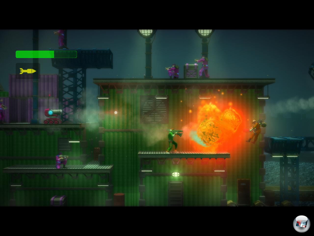 Euer Einsatz führt euch durch 20 Levels, die ihr auf einer bunten 3D-Karte in (fast) beliebiger Reihenfolge anwählen dürft. »Fast«, weil zum einen die zweite Hälfte anfangs nicht erreichbar ist, und zum anderen, weil ihr zum Betreten mancher Abschnitte spezielle Bedingungen erfüllen müsst: Mal braucht’s eine speziell gefärbte Chipkarte, mal rohe Gewalt in Form eines Raketenwerfers, der eine sonst unüberwindbare Passage einfach zerbröselt. Die Standard-Levels präsentieren sich ganz klassisch in Seitenansicht; ihr rennt von links nach rechts und schwingt euch von oben nach unten. Allerlei Gegner machen euch das Swingerleben noch schwerer; vom Soldaten über den Granatenschmeißer und den fliegenden Laserbot bis hin zum schubsfreudigen Mini-Panzer ist jede Menge Feindesmaterial vertreten. Die Widersacher bieten dabei einen erstaunlichen Grad an Intelligenz: Sie reagieren schnell darauf, wenn man sich von hinten an sie anschwingen möchte, die suchen sich stabile Deckung, sie weichen Beschuss aus – und sie fallen physikalisch unterhaltsam aus dem Bild, wenn man sie dann doch erledigt hat.