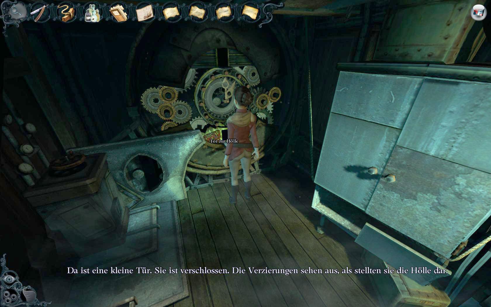 Geradezu verstörend fällt dagegen die Kameraregie in den Zwischensequenzen aus. Die Schockmomente schlagen immer genau dann zu, wenn ich wieder einmal gedankenverloren durch einen Korridor spatziere und z.B. darüber nachgrüble, mit welchen notdürftig zusammengesteckten Werzeugen ich die Kran-Mechanik in der Messe reparieren könnte. Urplötzlich ertönt ein fieses Quietschen und die Kamera zoomt an Anna vorbei – hinter ihr ein dreckig grinsender Matrose. Eine Zehntelsekunde später ist er wieder verschwunden. Es sind immer nur kurze Momente, welche mich zusammenzucken lassen und Anna unsicherer machen, doch genau dieser spärliche pointierte Einsatz macht das Abenteuer so schön schaurig.