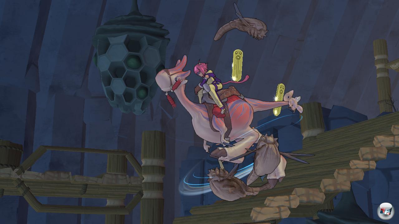 Als vom Spring-und-Laufalltag abweichendes Element hat man in bestimmten Abschnitten auch die Möglichkeit, auf einem rosafarbenen Noot durch die Botanik zu reiten. Doch die Levels, in denen man mit dieser Mischung aus einem Chocobo und den Star Wars’schen Tauntauns durch die Botanik galoppiert, unterscheiden sich nur wenig vom restlichen Rumgehoppse – man kann nur nicht klettern.