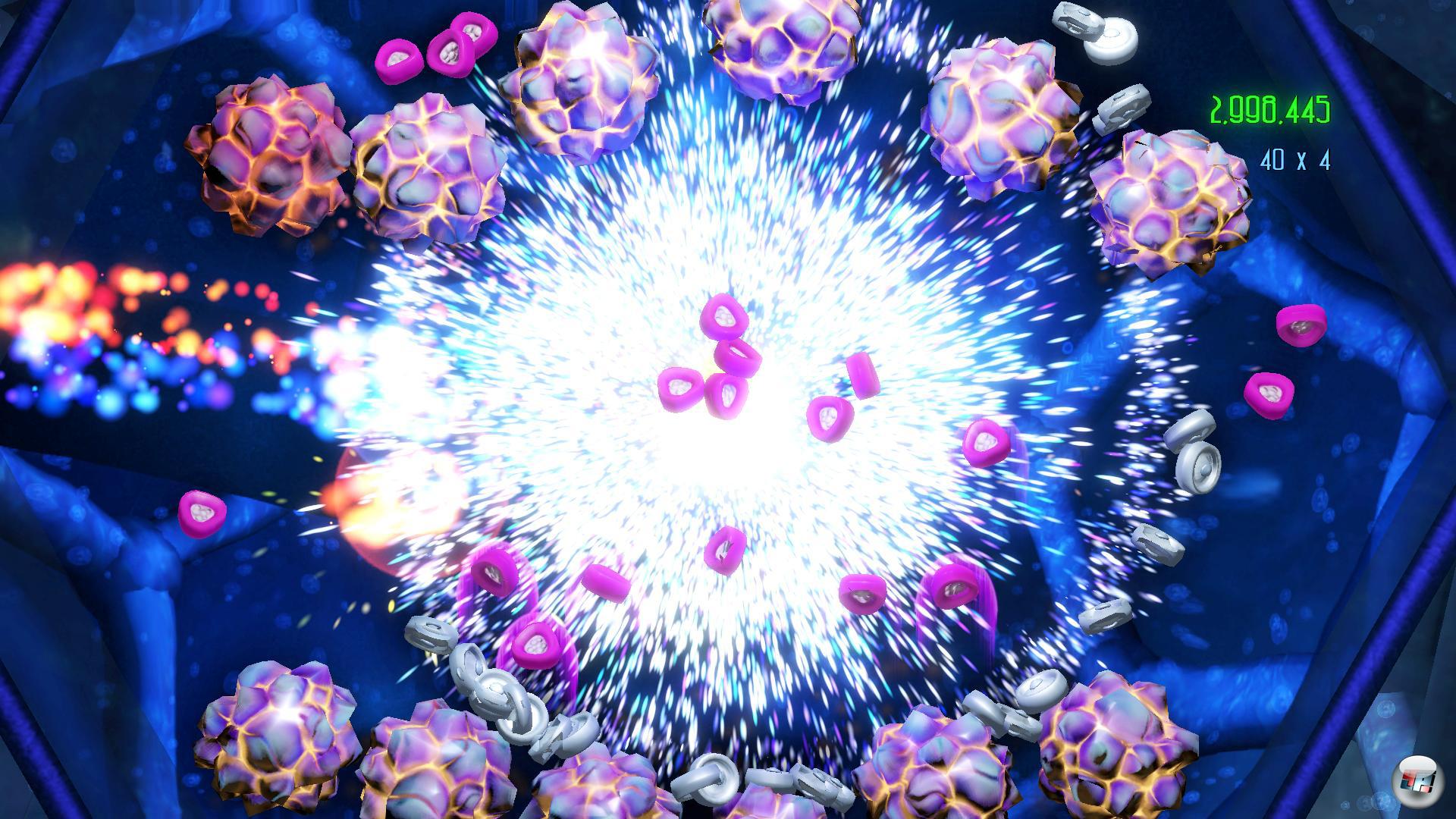 Denn es kommen nicht nur zwei neue Geschwindigkeitsstufen, die bei erfolgreicher Bewältigung mit fetten Punkte-Boni locken. Vor allem die vorher angekreideten fehlenden Mehrspieler-Modi werden hizugefügt – und wie: Zum einen könnt ihr mit bis zu vier Spielern kooperativ versuchen, den sieben Mikroorganismen den Garaus zu bereiten. Dabei teilen sich aber alle den Pool an verfügbaren Leben.