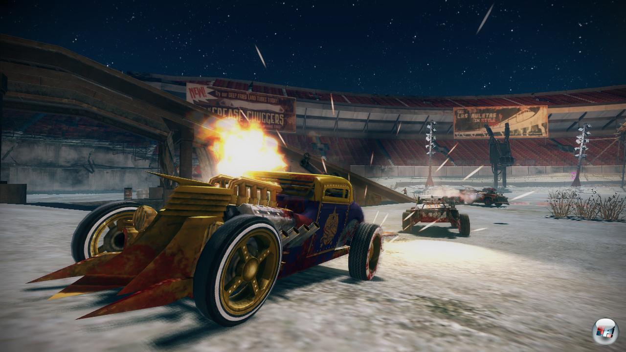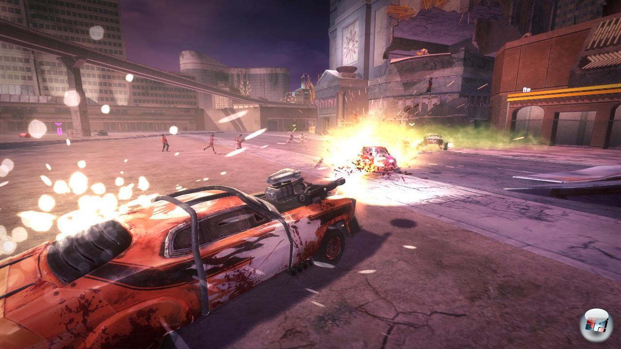 Bei der Story (braucht ein Zombiespiel überhaupt eine Story?) fühlt man sich leicht an Elemente aus Dead Rising 2 erinnert: Man ist Überlebender einer Zombie-Epidemie und Teilnehmer einer Fernsehshow, die in der Wüstenstadt Las Ruletas stattfindet. Hier tritt man in sechs Zonen nicht nur gegen sieben andere durchgeknallte Fahrer an, um die virtuellen Zuschauer vor den Bildschirmen zu unterhalten, sondern sieht sich auch Zombiehorden gegenüber.![]()