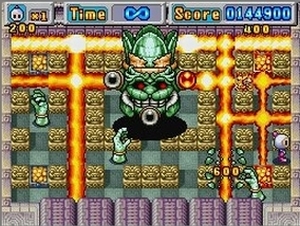 TurboGrafx-16, am Saturn und am GameCube – und natürlich bleibt das auch am DS so. Der Einzelspielermodus besteht aus 100 Levels, in denen regelmäßig ein dicker Obermotz darauf wartet, von euch zurück in die Steinzeit gebombt zu werden. Während das Spielprinzip gewohnt locker dahinflockt, warten einige Neuerungen auf den DS-Jünger: So werden eingesammelte Items (Bomben-Verstärker, Geschwindigkeits-Upgrades, Zeitverzögerer etc.) nicht wie üblich sofort eingesetzt, sondern auf dem Touchscreen im Inventar gelagert. Dort könnt ihr sie entweder sofort aktivieren oder für einen späteren Level aufheben. Ihr verliert nämlich alle aktivierten Items, wenn ihr mal draufgeht – eine nette taktische Komponente.