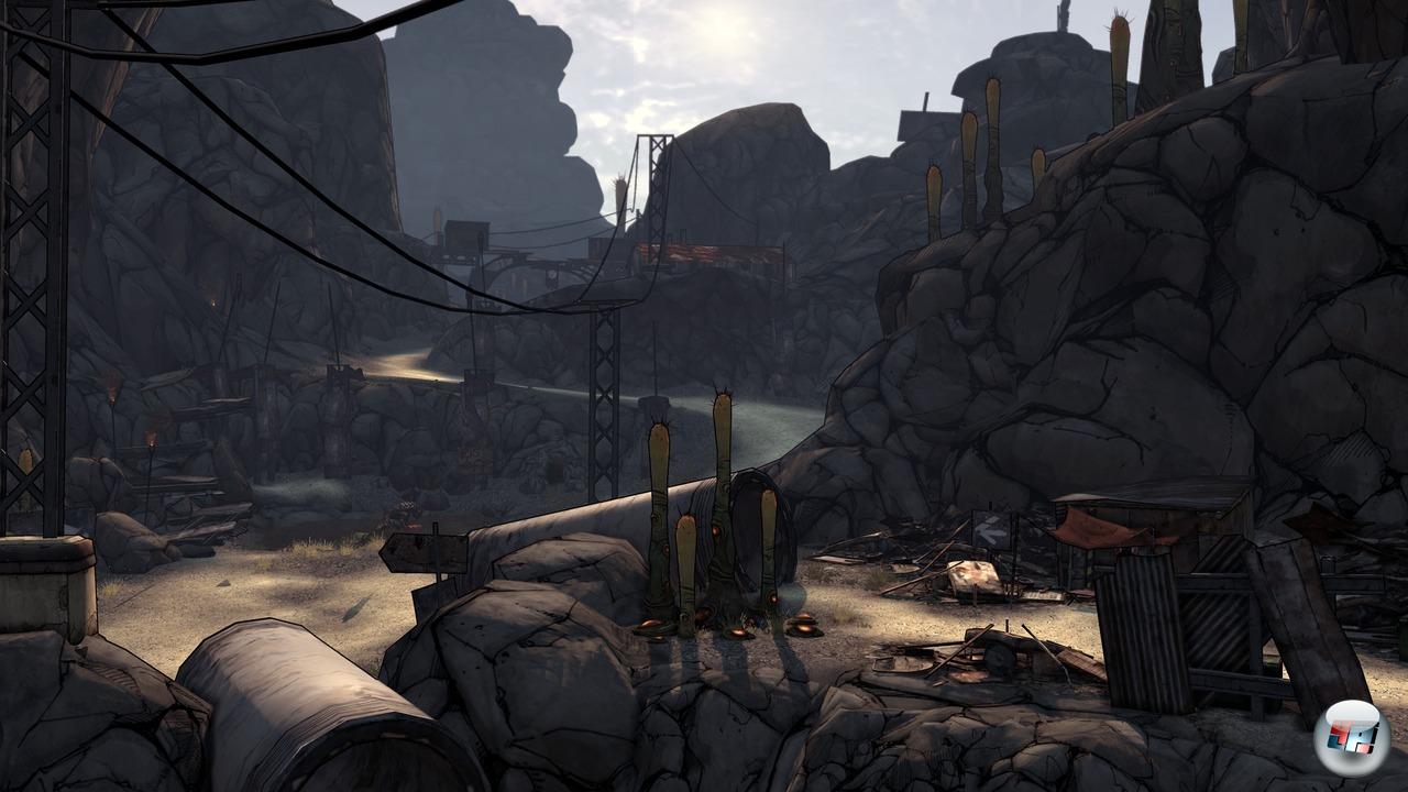 Dass ich in einem Action-Rollenspiel zum Selbstzweck einen Auftrag nach dem nächsten erledige, kann ich verstehen. Immerhin trägt gerade das unkomplizierte Anhäufen von Erfahrungspunkten viel dazu bei, dass ich selbst nachts um zwei „nur noch eine Mission“ angehen will. Dass sämtliche Figuren aber die gesamte Zeit über starr am Fleck verweilen, sich noch dazu stark ähneln und neben dem Verteilen von Aufgaben so gut wie kein Wort mit mir wechseln, ist gerade vor dem visuell beeindruckenden Pandora einfach nicht zeitgemäß. Es ist nicht so, dass Gearbox nur das Nötigste tut, um eine Welt zu erschaffen – es ist vielmehr so, dass sie schon vorher, beim Erschaffen der Kulissen, damit aufgehört haben. Hier und da brauchten sie noch eine Pinnwand für noch mehr Missionen, dort stellen sie noch eine Art Einwohner ab und da drüben passt es ihnen ganz gut, dass ich zum tausendsten Mal einen umgekippten Roboter repariere.