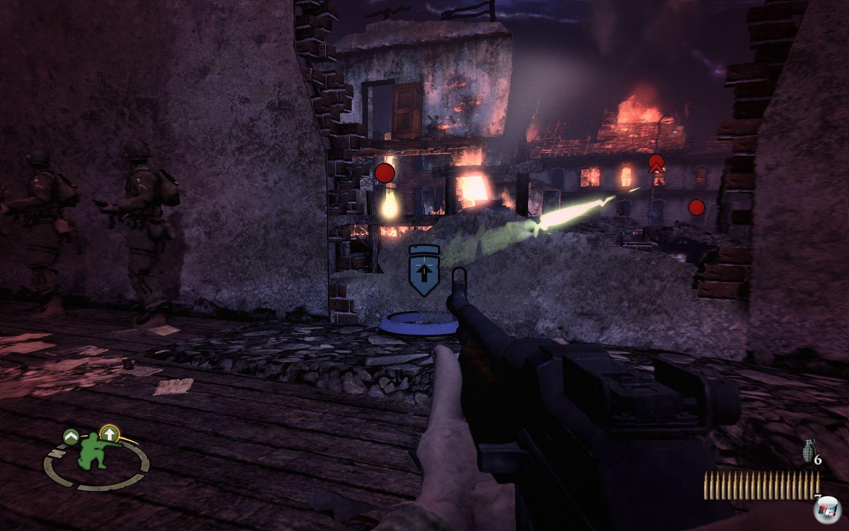 Von gelegentlichen Aussetzern abgesehen reagieren Freund und Feind aber recht intelligent: Seid ihr beim Flankieren unachtsam, eröffnen die Gegner das Feuer auf euch, bevor ihr die schützende Deckung erreicht habt. Setzt ihr die Deutschen unter Druck, huschen sie gerne auch von einer Mauer zur nächsten. Leider gilt das nicht für ihre Kameraden, die hinter einem Lattenzaun oder anderen zerstörbaren Holzgegenständen lauern. Ist die Deckung zerlegt, habt ihr meist freie Schussbahn.