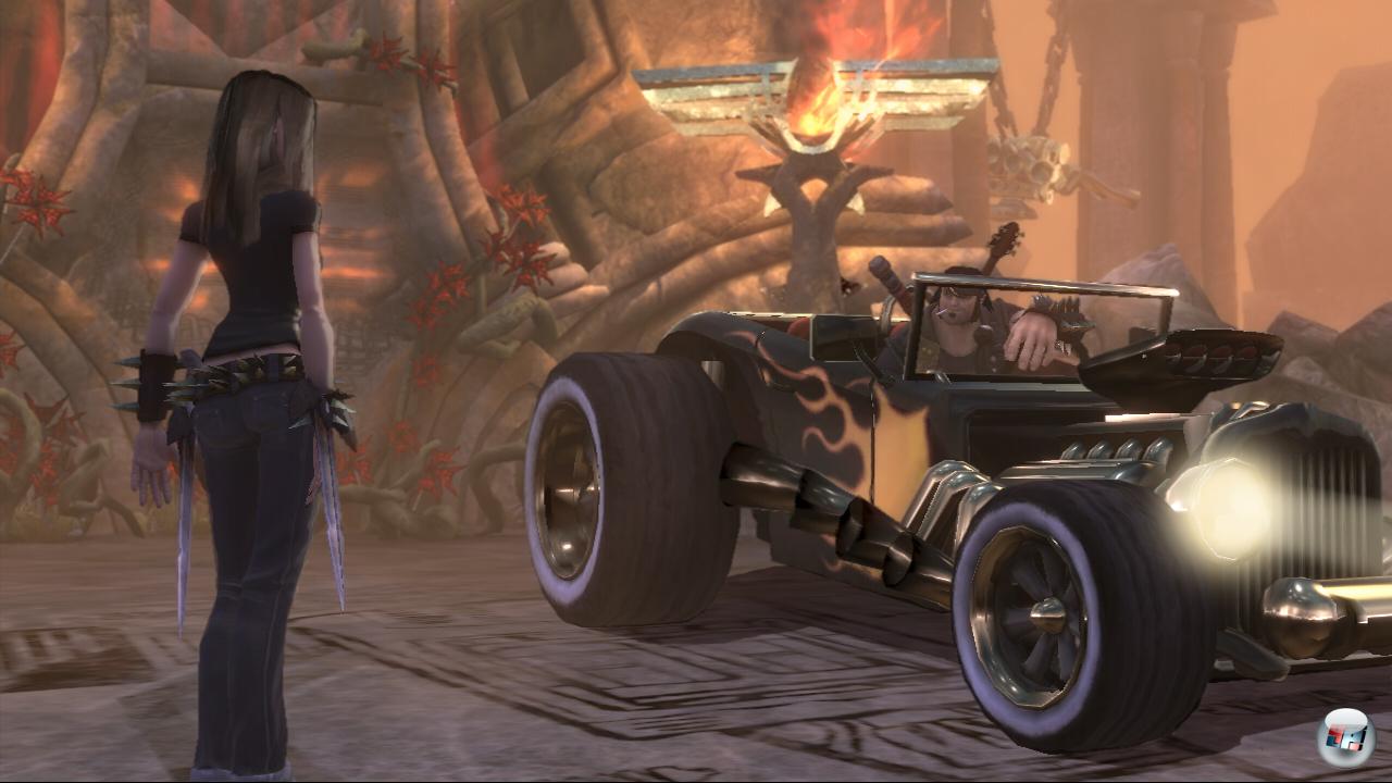 sich mit diversen Saiten gehörig aufmotzen, um noch mehr explosive Energien zu entwickeln. Die dicksten Waffen sind jedoch für den Hotrod gedacht: Unter den Primär- und Sekundärwaffen finden sich u.a. MG-Geschütze, Stromblitze, zielsuchende Raketen und ein flammender Seitenauspuff, der Angreifer in ein Häufchen Asche verwandelt. Wem das Äußere nicht zusagt, darf die Karosse sogar neu lackieren. Daneben darf man seinen treuen Gefährten außerdem Monumente an einem Mout Rockmore errichten lassen. Das alles gibt es natürlich nicht nur für ein freundliches Lächeln – das Leben ist schließlich kein Gratiskonzert. Stattdessen will auch Ozzy Bares sehen, wobei in der Welt von Brütal Legends die gewohnten Scheine und Münzen durch Feuerattribute darstellen. Diese verdient man sich durch das erfolgreiche Bestehen von Haupt- und Nebenmissionen. Letztere bestehen aus kleinen Minispielen, bei denen man etwa auf einer Hebebühne heran stürmende Gegnerwellen abwehrt, unter Zeitdruck Bierfässer zur Strandparty befördert oder ein Wettrennen gegen einen arroganten Raser in Angriff genommen werden muss. Außerdem gilt es, ein Haus von Fledermäusen zu befreien, einem Rocker ein Date mit seiner Flamme zu ermöglichen, einen Wettstreit um den Ruf des besten Jägers zu gewinnen sowie Schleichangriffe gegen den Feind zu starten. Das alles klingt sehr abwechslungsreich – wäre es auch, wenn man das richtige Maß gefunden hätte. Leider dominieren aber die Schleichangriffe und Sequenzen auf der Hebebühne, die immer nach dem gleichen Schema ablaufen, an dem man sich schnell satt gesehen hat. Hinzu kommt, dass die bewegliche Leuchtmarkierung, die einem den Weg bei Wettrennen weisen soll, mit den gleichen Problemen zu kämpfen hat, wie der Leuchtstrahl, der die Position der nächsten Position anzeigt. Bei hellem Tageslicht sieht man sie einfach nicht oder die Ziele sind einfach zu weit entfernt, so dass man immer wieder einen Blick auf den Kartenbildschirm werfen muss. Warum hat man nicht einfach ein Navigationssystem mit Richtungspfeilen eingebaut?
