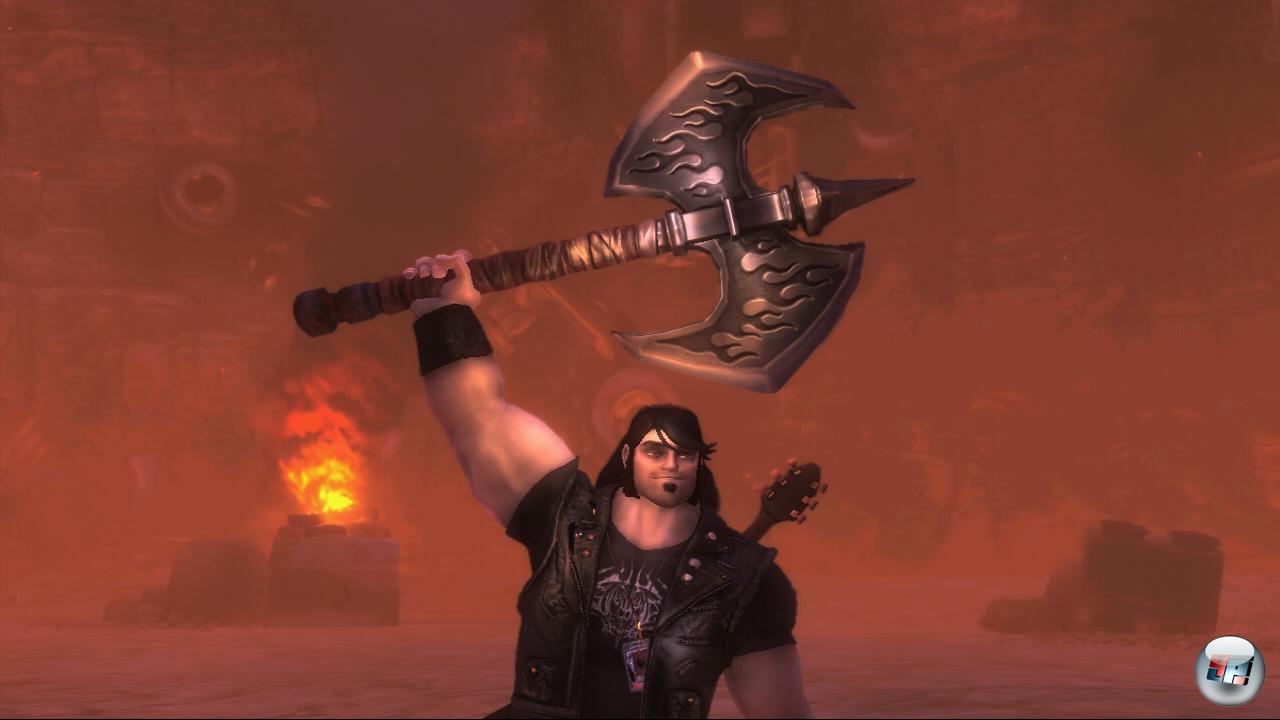 Denn früher oder später zeigt Brütal Legend sein wahres Gesicht, was einige Spieler schockieren dürfte: Das anfängliche Hack’n’Slay verwandelt sich plötzlich in ein Echtzeit-Strategiespiel im Stil von Pikmin und Overlord! Dabei ist die eigene Bühne quasi das Hauptquartier, das in mehreren Stufen ausgebaut werden kann. Auch Einheiten von Headbangern über unsichtbare Roadies und Heil-Bassisten bis hin zu Vehikeln wie dem Schädelspalter oder Donnervogel werden hier produziert. Dabei nimmt jede von ihnen einen bestimmten Platz in den maximal 40 verfügbaren Slots ein – man kann also nicht unendlich viele Einheiten bauen. Als Rohstoff und Zahlungsmittel dienen Fans, die man sich verdient, indem man über Fan-Gysieren per Gitarren-Riff Merchandise-Stände der eigenen Band platziert. Dies funktioniert allerdings nur, wenn keine gegnerischen Einheiten in der Nähe sind oder der Feind schon schneller einen Stand gebaut hat. In diesem Fall muss erst das Abrisskommando anrücken und das Ding dem Erdboden gleich machen, wobei das Hauptziel selbstverständlich daraus besteht, genau das Gleiche mit der Bühne des Widersachers zu tun. Zwar lassen sich einzelne Gruppen anwählen, an einer durch ein weiteres Riff herbei gezauberten Flagge sammeln und auch zusammen mit dem Teamangriff verwenden, doch fallen die Schlachten insgesamt sehr chaotisch aus, so dass man schnell mal die Übersicht verliert. Problematisch ist in diesem Zusammenhang, dass man seinen Einheiten nur dann Befehle erteilen kann, wenn man sich in ihrer Nähe befindet. Zum Glück wachsen Eddie aber schnell Dämonenflügel, mit denen man nicht nur eine bessere Übersicht bekommt, sondern auch blitzschnell zwischen seinen Truppen hin- und herfliegen kann. Ich kann gut verstehen, dass viele Spieler diesen Schwenk hin zu einem recht oberflächlichen Strategie-/Actionspiel als herben Stilbruch empfinden – vor allem, weil sie einen Großteil der recht kurzen Kampagne ausmachen, die auch etwas abwechslungsreicher hätte ausfallen dürfen. Während Schafer am Anfang richtig Gas gibt und immer wieder neue Dinge einführt, läuft es gegen Ende meist nach dem gleichen Schema ab: Zunächst muss man seinen Tourbus zur nächsten Location eskortieren und alles platt machen, was sich einem in den Weg stellt. Anschließend folgt die nächste Schlacht, wenn man sich nicht noch mit Sekundärmissionen ablenken will. Darüber hinaus sorgen die wenigen, aber dafür großartigen Bosskämpfe vom Schlag einer gigantischen Metal-Spinne für grandiose Momente – genau wie die Fluchtsequenzen, bei denen die Umgebung mit heftigen Explosionen und herum fliegenden Teilen zerlegt wird, während aus den Lautsprechern „Through the Fire and Flames“ von Dragonforce dröhnt. In diesen Momenten muss man Brütal Legend einfach lieben!