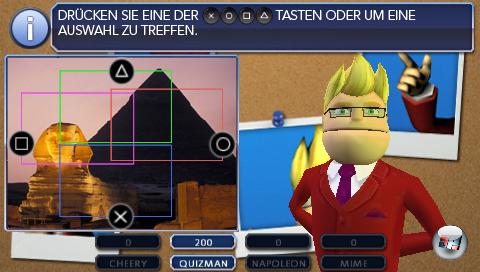 Ebenfalls sechs Ratefüchse dürfen einen Quiz-Moderator sowie den gleichnamigen Spielmodus wählen: Der Chef an der PSP liest die abgebildeten Fragen vor, verteilt entsprechend der Antworten Punkte und darf sogar fies genug sein, für willkürlich aufgestellte Regelbrüche Zähler wieder abzuziehen. Zwar durchaus spaßig, aber letzten Endes auch nicht viel sinnvoller als ein Knobelheft. Zu guter Letzt bleibt noch der Gamesharing-Modus, über den vier Zocker ganz klassisch gegeneinander antreten. Quintessenz des Ganzen: Das gute alte Buzz-Spielgefühl stellt sich zwar nicht ein, aber immerhin wird für alle Multiplayermodi nur eine UMD benötigt.