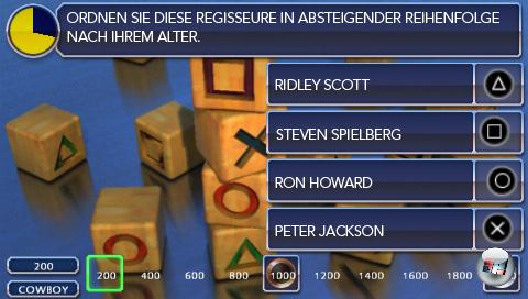 Bereichen des täglichen Lebens lauern nur darauf, eure graue Masse auf die Probe zu stellen – Film, Musik, Allgemeinwissen, Sport, Verrücktes und viel mehr wird zum Thema. Idealerweise natürlich für mehrere Spieler: Bis zu sechs Gehirnathleten dürfen sich in der Spielvariante »Weitergeben« eine PSP teilen. Der Name lässt dabei nicht viel Interpretationsspielraum; der Handheld wird nach jeder erfüllten Frage einfach weitergereicht. Vorher darf aber oft genug noch eine Stolperfalle für den nächsten Kandidaten ausgewählt werden – wie ein möglichst nichts sagender Bildausschnitt, zu dem er dann eine Frage beantworten muss. Durchaus fies. Hier, und nur hier sind übrigens verschiedene Schwierigkeitsgrade und Spiellängen wählbar.