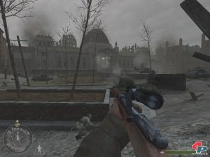 Die Akustik war den MoH-Entwicklern schon immer heilig, auch Infinity Ward ließ da besondere Sorgfalt walten: die Schusseffekte stammen von Original-Waffen, das Kettenrasseln der Panzer wurde ebenfalls von echten Modellen aufgenommen. Ein Highlight lässt sich z.B. erleben, wenn ihr zu nahe an einer Explosion steht: Eine Zeit lang hört ihr neben einem Fiepen alle Umgebungsgeräusche wie durch Watte, außerdem wird das Bild geisterhaft verzerrt. Alles zusammen ergibt besonders auf Surround-Systemen eine fast schon irrsinnig dichte Atmosphäre, die von der Sprachausgabe angemessen unterstützt wird. Zwar fehlen der deutschen Version die merklich unterschiedlichen Akzente der Original-Version, aber die sehr oft zu hörenden Propaganda-Sprüche,